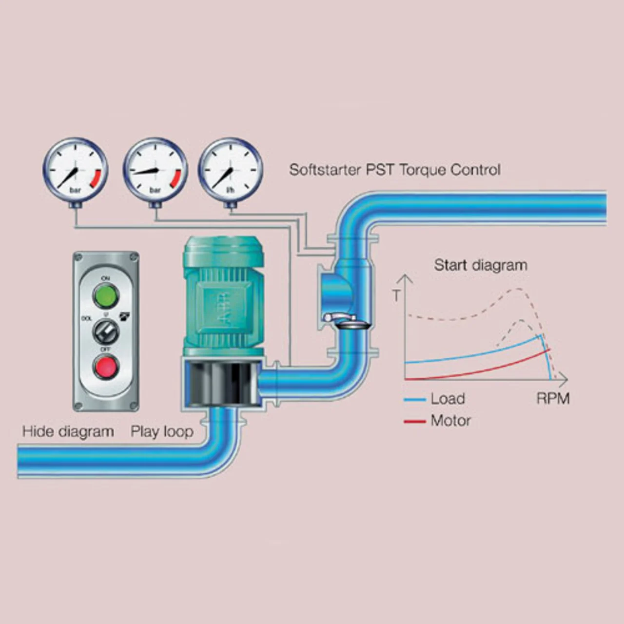 Über die Spannung ist es möglich, das Drehmoment, welches wiederum die Motordrehzahl und somit den Wasserfluss bestimmt, zeitabhängig optimal zu regeln. Mit Hilfe von Messungen aller drei Phasenspannungen und Ströme und einem speziellen Drehmoment-Regelungsalgorithmus lässt sich die Verzögerung des Wassers in den Leitungen so regeln, dass Druckschläge beim Auslaufen der Pumpen sicher zu verhindern sind.