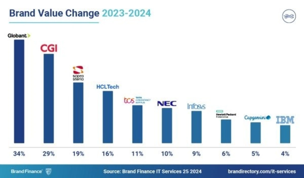 Globant aus Argentinien hat ein außergewöhnlich schnelles Wachstum seines Markenwerts mit einem Zuwachs von 34 Prozent auf 1,6 Mrd. Dollar verzeichnet und ist damit die am schnellsten wachsende IT-Service-Marke im Jahr 2024. Das ist auf die wachsende globale Präsenz und die starke finanzielle Performance zurückzuführen, wobei die Brand Finance-Studie einen deutlichen Anstieg der Wertschätzung für die Marke und andere Markenstärkemetriken feststellt: In diesem Jahr verbesserte sich die Markenstärke von 77 auf 81, was Globant zu einer AAA-bewerteten Marke macht. Dank dieser Steigerung sichert sich Globant einen Platz unter den Top-5 der stärksten IT-Dienstleistungsmarken der Welt.