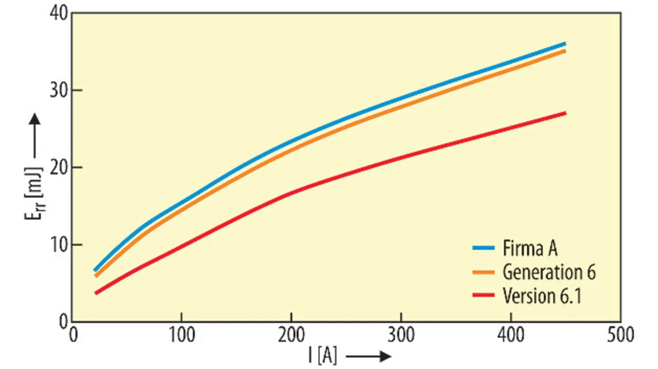 Für die eben erwähnten Recovery-Verluste wurden die Untersuchungen unter gleichen Bedingungen durchgeführt (Bild 4). Im Vergleich zur Vorgängergeneration konnte eine Verbesserung um fast 9 mJ bei einem Strom von 400 A erzielt werden. Als Ergebnis für die neue Version der CSTBT-Leistungsmodule kann festgehalten werden, dass sowohl die Einschaltverluste E(on) als auch die Recovery-Verluste E(rr) der Freilaufdiode im Vergleich zur 6. Generation und im Vergleich zu den marktüblichen IGBT-Modulen deutlich verbessert wurde.