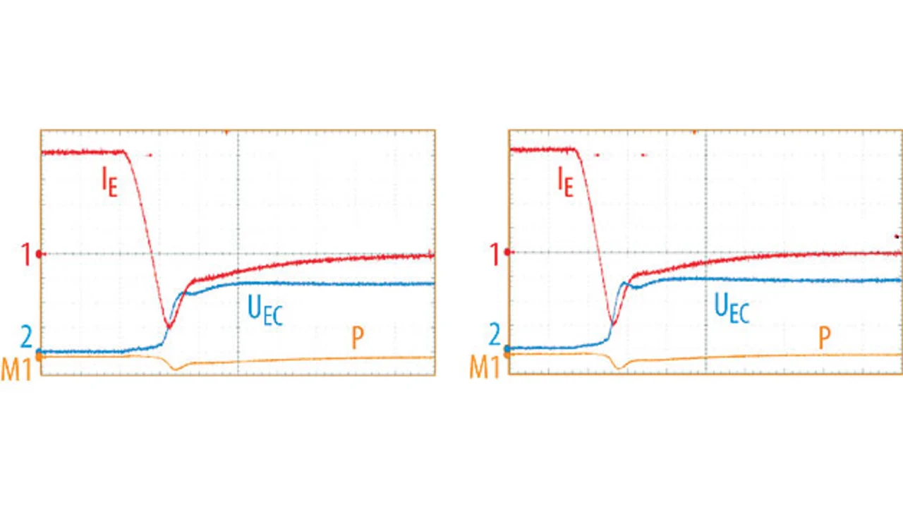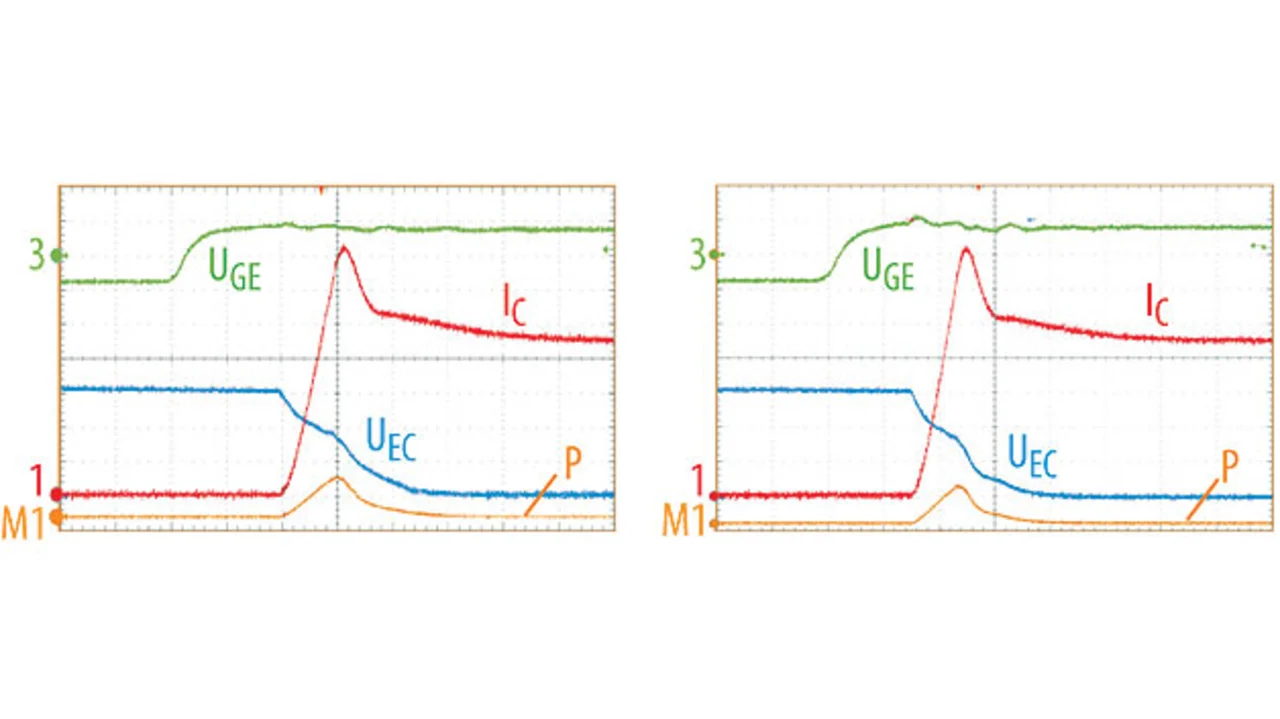 Die analysierten Spannungs- und Stromverläufe wurden bei einer Zwischenkreisspannung von 600 V, einem geschalteten Kollektorstrom von 450 A und einem Gesamt-Gatewiderstand RGtotal von 4,3 Ω aufgenommen (Bild 5). Beide Chip-Generationen zeigen in diesem Betrieb keine Oszillationen.