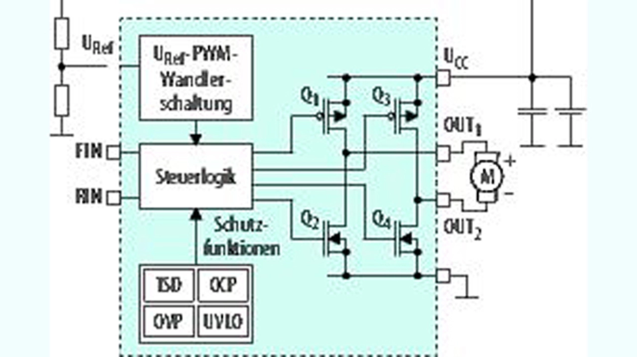 Diesen Herausforderungen begegnet Rohm mit den H-Brücken-Treibern der Serie BD62XX. Dabei wird eine traditionelle Spannungssteuerung über eine Spannung URef intern in eine PWM-Steuerung umgesetzt. Dadurch wird ein hoher Wirkungsgrad ohne zusätzliche externe Komponenten möglich. Dabei ist aber auch ein direkter PWM-Eingang möglich. Die implementierte Ausgangsstufe einer p-n-Kanal-MOSFET-Konfiguration verringert die Verluste im Vergleich zu bipolaren Transistoren und macht eine Spannungserhöhung überflüssig. Die integrierte Schutzschaltung gegen Durchgangsstrom hindert die oberen und unteren MOSFETs daran, gleichzeitig zu schalten, was einen irregulären Stromfluss verursachen würde. Insgesamt sind vier Schutzschaltungen verbaut.
