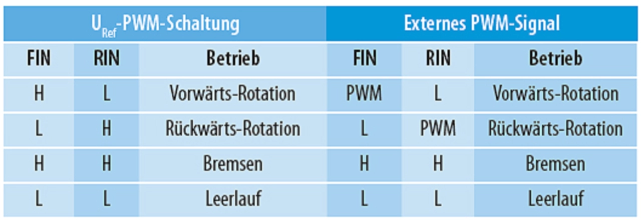 Wie Bild 4 zeigt, ermöglicht die eingebaute URef-PWM-Wandlerschaltung eine PWM-Ansteuerung mit Gleichspannung. Zu sehen ist der Betrieb mit FIN- und RIN-Logikeingängen (Tabelle). Zusätzlich ist es möglich, ein externes PWM-Signal direkt über die Eingänge FIN oder RIN einzuspeisen. Ein Ausgangsstufen-Transistor (Schalter) mit p-n-Kanal-MOSFET-Konfiguration erfordert keine Spannungserhöhung und ermöglicht eine geringere Anzahl von Komponenten.