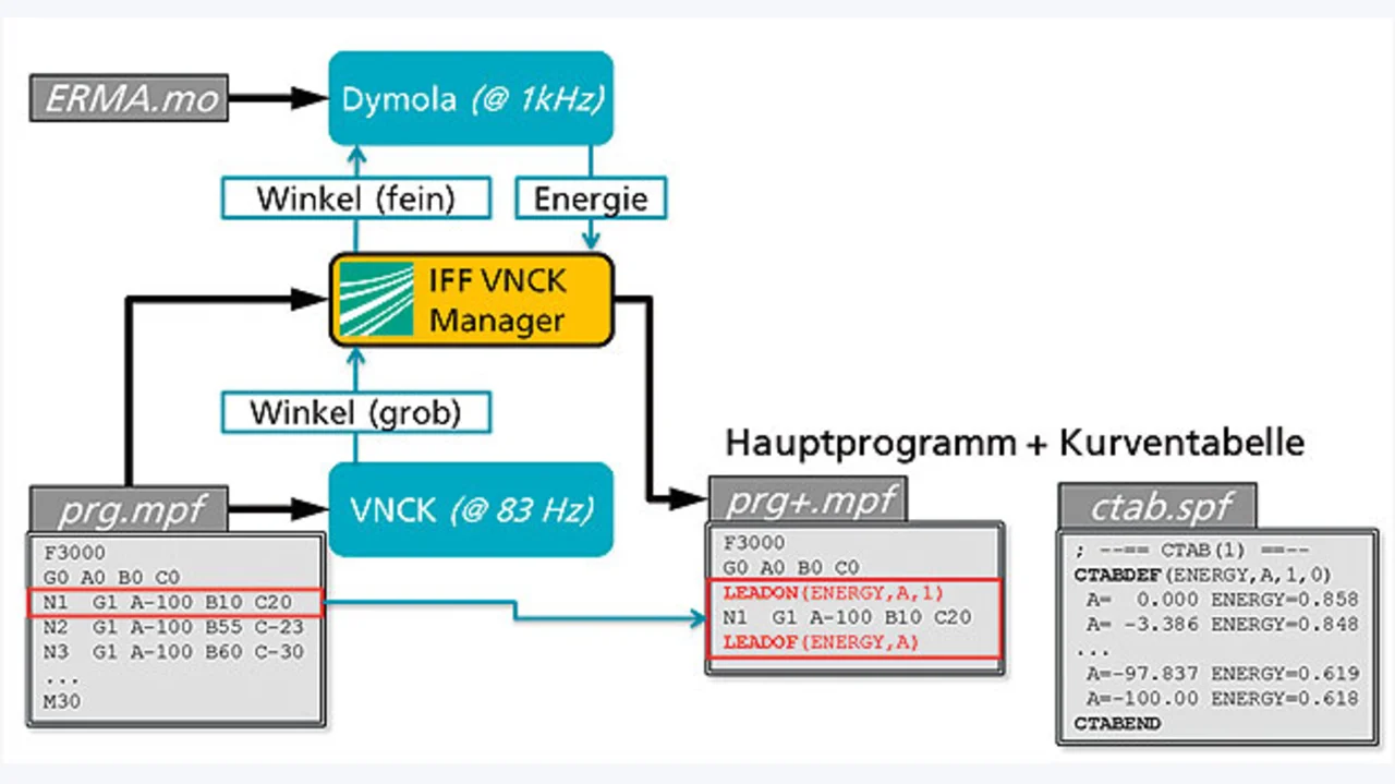 Der beschriebene Mechanismus von Leit- und Folgeachse kann auch mit der Drehachse des Schwungmassenspeichers angewandt werden. Dabei wird sie stets als Folgeachse betrachtet. Als Leitachse wird die Maschinenachse verwendet, welche für den jeweiligen auszuführenden Bewegungsbefehl relevant ist. Bevor eine Bewegung tatsächlich ausgeführt wird, muss die entsprechend vorbereitete Kurventabelle geladen werden (Bild 4). Hierfür werden Befehle vor der jeweiligen Programmzeile in das originale Steuerungsprogramm eingefügt.