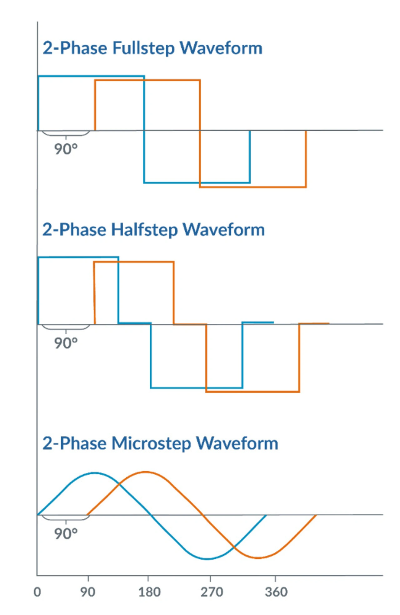 In der Schrittmotor-Terminologie werden die Phasing-Verfahren, die die Verstärker einsetzen, mit spezifischen Bezeichnungen wie Vollschritt, Halbschritt und Mikroschritt belegt. Die verschiedenen Verfahren beziehen sich auf die Anzahl der Spannungspegel, die über einen elektrischen Zyklus hinweg an jeder Motorspule anliegen. Abhängig von der jeweiligen Antriebstechnik dreht sich der Motor vorwärts oder rückwärts, wenn der externe Controller seine elektrische Phase entsprechend ändert.
