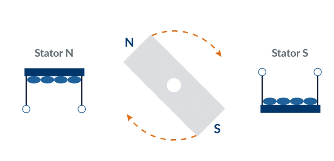 Bild 2 zeigt ein einfaches magnetisches Modell eines Schrittmotors. Den Rotor ist als rotierender Stabmagneten vorstellbar, der mit einem extern gesteuerten magnetischen Feld (dem Stator) interagiert. Das so erzeugte Drehmoment ist Null, wenn das N-S-Rotorfeld mit dem magnetischen N-S-Feld des Stators (auch B-Feld genannt) übereinstimmt. Es erreicht ein Maximum, wenn die beiden Felder unter einem Winkel von 90 Grad (elektrisch) zueinander stehen. Dabei ist zu beachten, dass der interne Aufbau eines Schrittmotors in der Realität nicht genau mit dem Bild übereinstimmt. Trotzdem bietet es eine brauchbare Vorstellung zum Verständnis der Funktion des Motors.