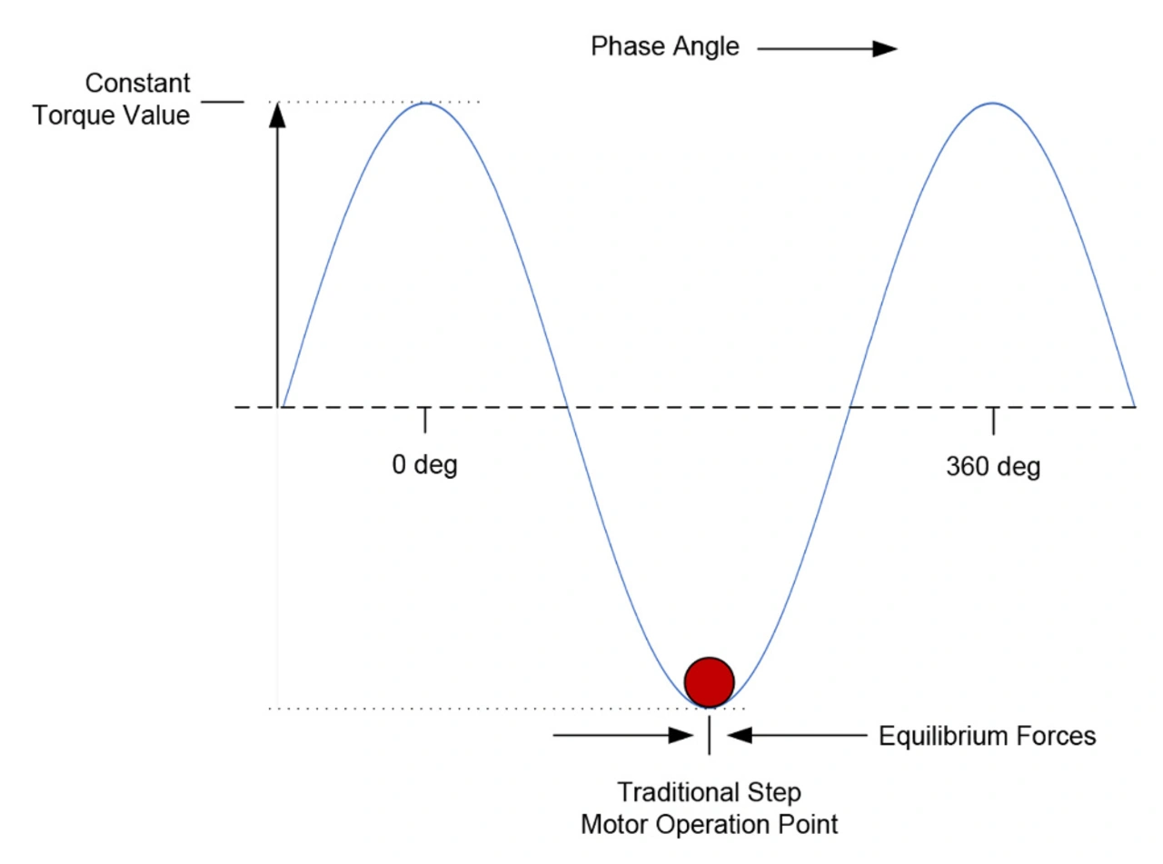 Wenn die Statorwicklungen mit einem Strom angesteuert werden, bildet sich ein sinusförmiges Tal der Kraft aus, die den Schrittmotor zum Einrasten an einer spezifischen Position veranlasst. Je mehr Strom durch die Spulen fließt, desto tiefer ist das Tal. In diesem Profil der Krafteinwirkung mit ihren Höhen und Tiefen wird überall dort, wo die Kurve horizontal verläuft, kein mechanisches Drehmoment erzeugt. Überall dort, wo die Kurve am steilsten verläuft, ist das erzeugte Drehmoment am größten.