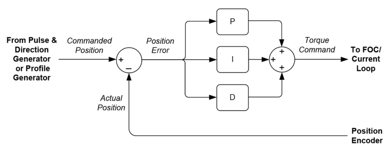 Die Steuerschaltung nach Bild 5 besteht im Wesentlichen aus drei Elementen: einem PID-Regelkreis zur Positionierung, einem Stromregelkreis und einem Schaltverstärker mit Controller zur Strommessung. Wie in Bild 5 gezeigt gibt die PID-Schleife eine Sollposition vor, entweder über einen externen Pulsgenerator (pulse-and-direction source) oder einen internen Profilgenerator. Sie leitet mithilfe der gemessenen Encoder-Position einen Positionsfehler ab und generiert nach der Filterung per PID einen Befehl für die Stromsteuerung.