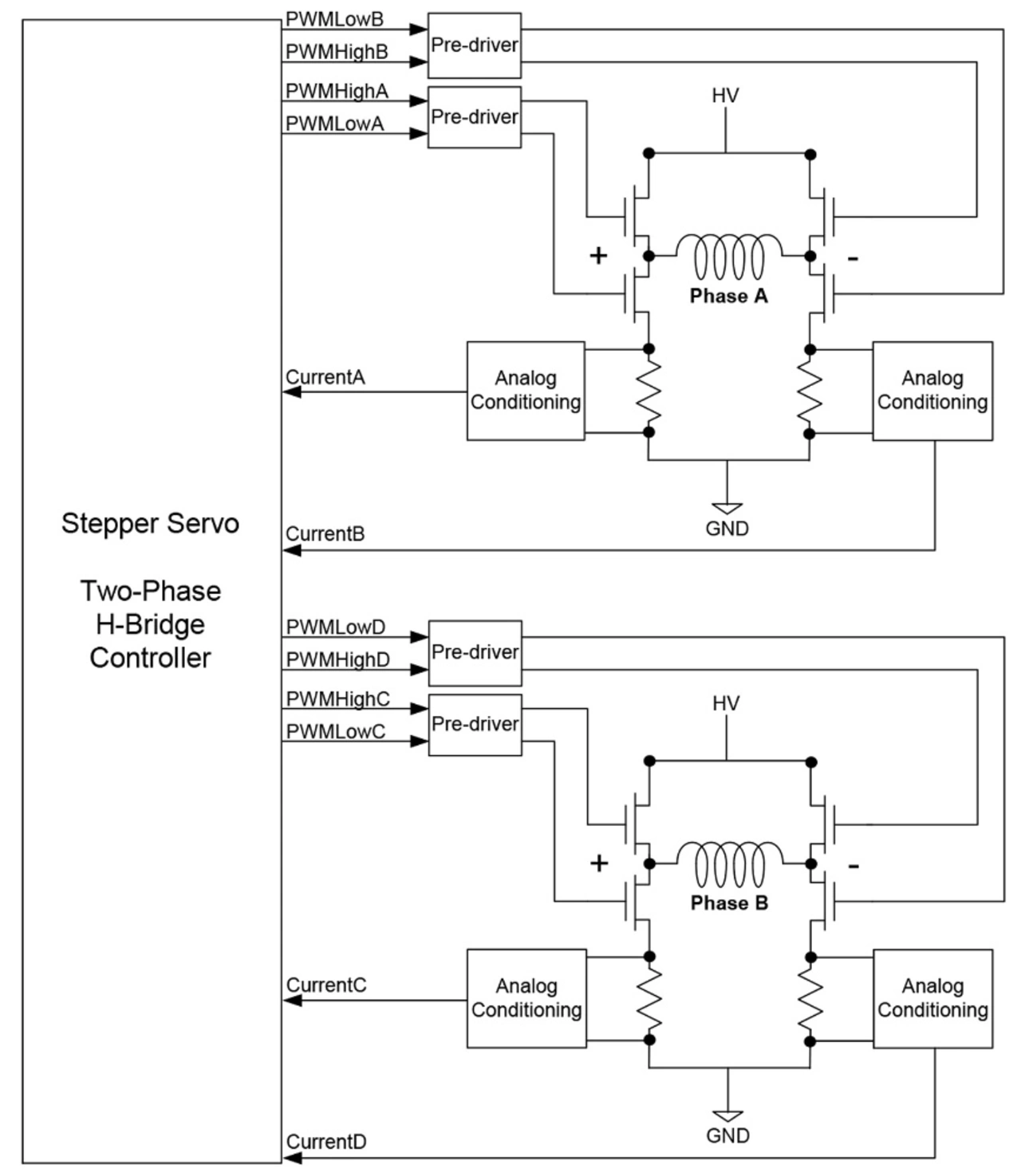 Während dieses Schema für die meisten traditionellen Schrittmotorsteuerungen gut genug ist, genügt es nicht für die Stepper Servo Controller. Diese nutzen stattdessen Steuertechniken, wie sie für bürstenlose DC-Motoren verwendet werden; sie steuern explizit den Strom während aller Phasen der erzeugten Wellenform.
