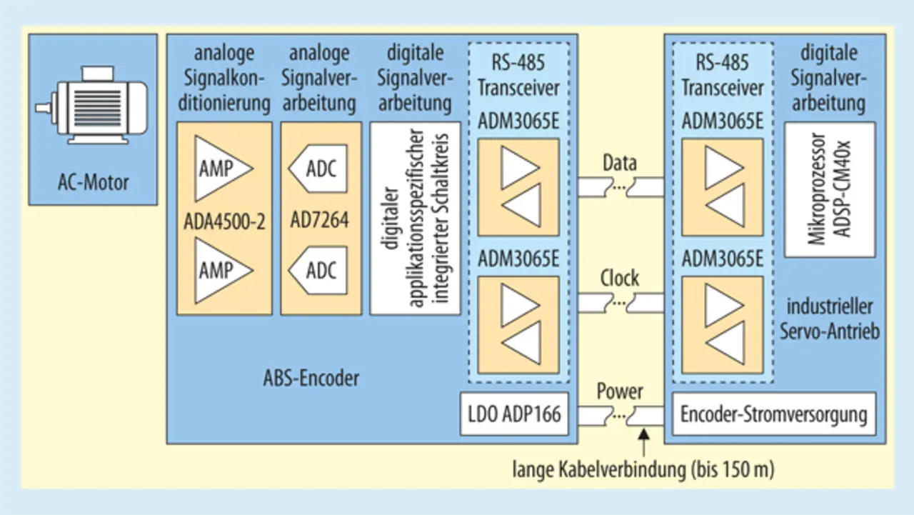 Die RS-485-Kommunikationsschnittstelle zwischen Servo-Antrieb und ABS-Encoder verlangt normalerweise hohe Datenraten von bis zu 16 MHz sowie geringe Signalverzögerungen. Die RS-485-Verkabelung beträgt im Normalfall maximal 50 m, kann sich in manchen Fällen aber auch bis auf 150 m erstrecken. Encoder-Applikationen in Motorsteuerungen stellen für die Datenkommunikation Herausforderungen dar. Elektrisches Rauschen und lange Leitungsverbindungen wirken sich auf die Zuverlässigkeit der RS-485-Kommunikation aus.