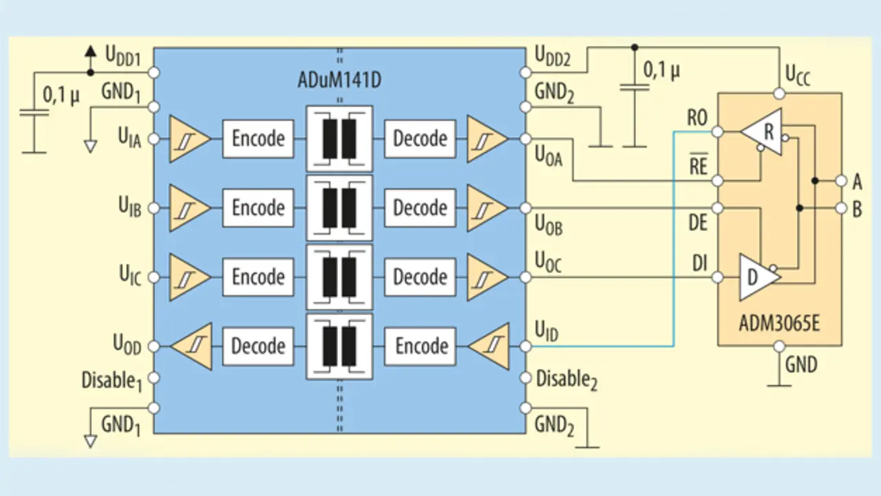 Den ADM3065E mit Signalisolation auszustatten, kann mit Hilfe des ADuM141D erfolgen. Der ADuM141D ist ein vierkanaliger Digitalisolator, der auf der iCoupler-Technologie von Analog Devices basiert. Der ADuM141D arbeitet mit Datenraten bis 150 Mbit/s und eignet sich damit für die Verwendung in Verbindung mit dem 50 Mbit/s schnellen RS-485-Transceiver ADM3065E (Bild 2).