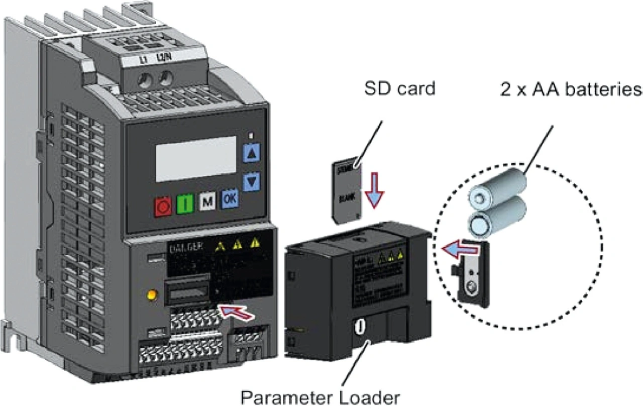 Sobald die Parametersätze komplett sind, kann ein Parameterlader Parametersätze von der V20 auf eine SD-Karte schreiben oder von der SD-Karte in die V20 lesen. Der Parameterlader und die SD-Karte können zum Klonen von Parametersätzen über mehrere Steuereinheiten hinweg verwendet werden. Die Parameter lassen sich in die Steuereinheiten herunterladen, noch bevor diese in die Fabrikhalle geliefert werden, was den gesamten Inbetriebnahmeprozess weiter beschleunigt und den Bedarf an technischer Unterstützung reduziert.