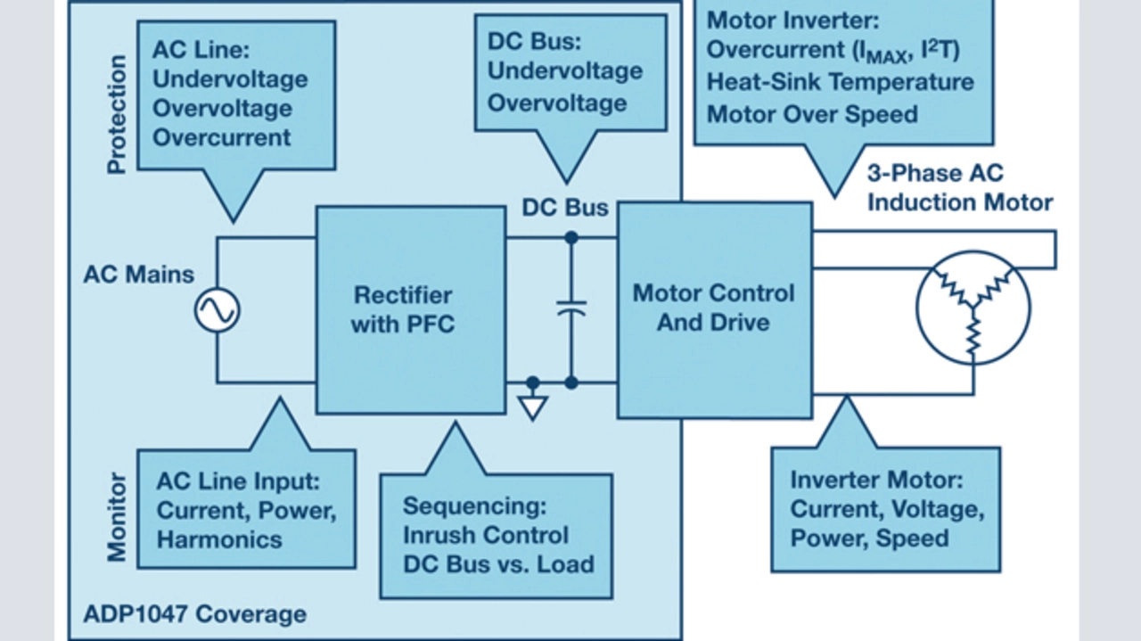 Eine Möglichkeit in diesem Fall besteht darin, einen preiswerten analogen PFC-Controller, wie etwa den »UC3854« von Texas Instruments, zu nutzen und ihn völlig unabhängig vom Haupt-Systemcontroller zu betreiben. Einen Zusatznutzen können digitale PFC-Controller, zum Beispiel der »ADP1047« von Analog Devices, bringen, wenn man sie in Verbindung mit dem Motorsteuerungsprozessor und einem Digitalisolator verwendet. Der Prozessor kann dann einen Teil der Sequencing-, Monitoring- und Schutzfunktionen auf den PFC-Controller auslagern und die Systemfunktionen bei reduzierten Kosten verbessern. Dies kann für Folgendes nützlich sein: