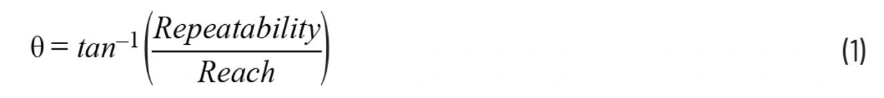Die am Gelenk-Encoder benötigte Winkel-Wiederholgenauigkeit (θ) lässt sich mit trigonometrischen Mitteln errechnen, nämlich als Arkustangens des Quotienten aus der Wiederholgenauigkeit und der Reichweite des Roboters: