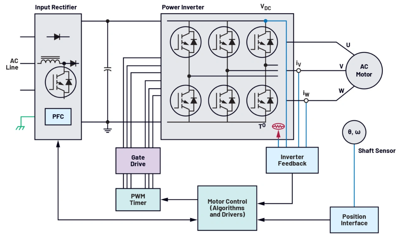 In den vergangenen Jahrzehnten war ein konstanter Trend weg von traditionellen, direkt am Netz betriebenen Motoren und hin zu mit Invertern betriebenen Motoren zu beobachten. Diese bedeutende Veränderung bei rotierenden industriellen Anlagen hat zu hohen Prozess- und Energieeinsparungen geführt und den Weg zu einer effizienteren Nutzung von Motoren und Anlagen geebnet. Leistungsfähigere Motorregelungen mit variabler Drehzahl und Servosysteme haben bewirkt, dass auch anspruchsvolle Anwendungen mittlerweile von einem Plus an Qualität und Synchronisation profitieren können. Die Leistungsfähigkeit und der Wirkungsgrad von Motoren profitieren gleichermaßen vom Einsatz eines Leistungs-Umrichters, einer leistungsfähigen Positionserfassung sowie einer Spannungs- und Stromregelung, wie sie in der Leistungsstufe in Bild 1 enthalten sind.