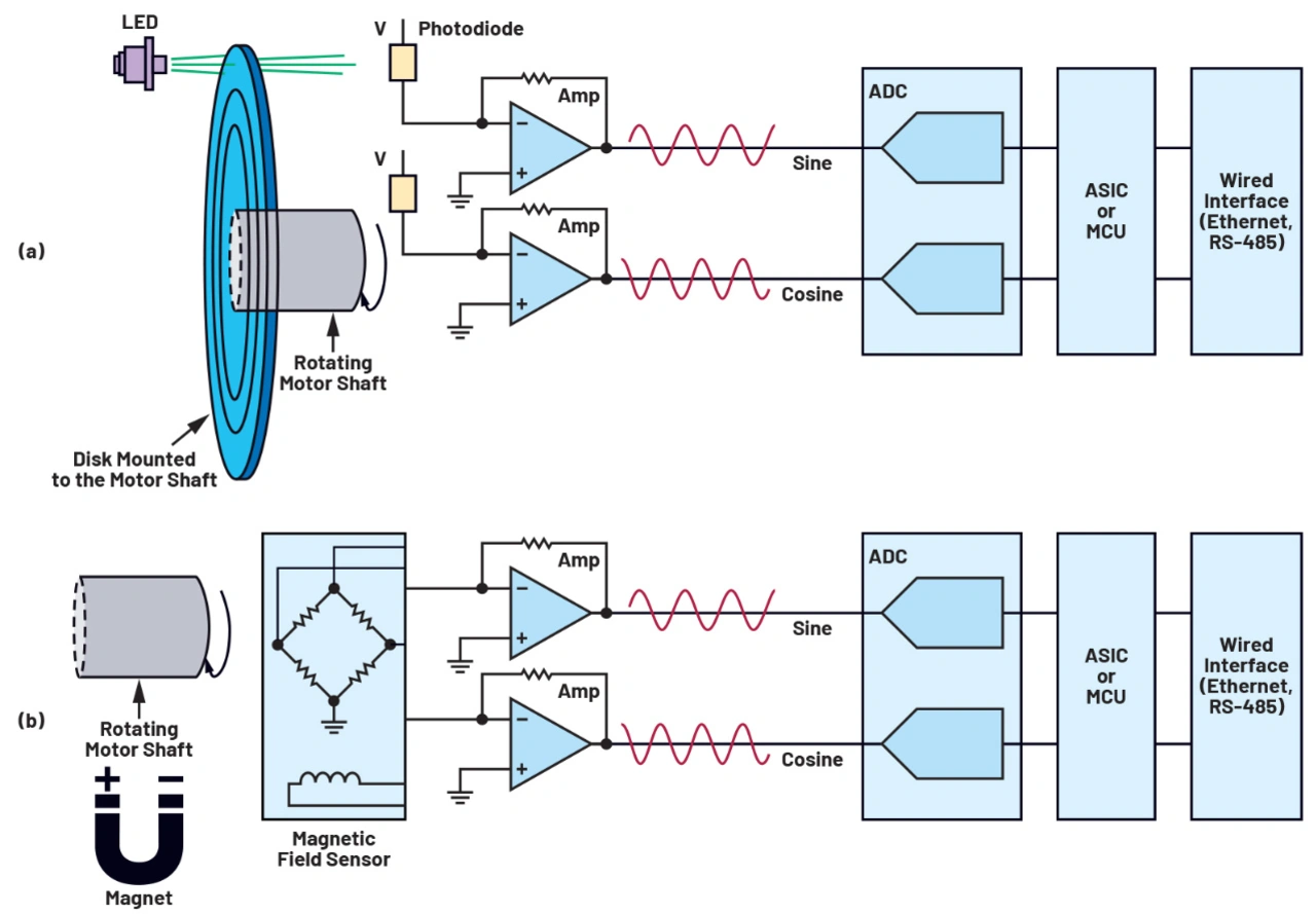 Roboter und diskrete Regelungssysteme sind auf präzise, reproduzierbare Informationen zur Drehzahl und Position der Motorwelle angewiesen. Positions-Encoder (Positionsgeber) verfolgen die Drehzahl und die Lage einer rotierenden Welle und liefern entsprechende Rückmeldesignale. Die größte Verbreitung haben optische und magnetische Encoder (Bild 2). In universellen Servoantrieben messen diese die Position der Welle, aus der wiederum die Drehzahl abgeleitet wird. Optische Encoder enthalten eine Glasscheibe mit geätzten oder aufgedruckten, feinen Strichen, die mithilfe einer Fotodiode abgetastet werden. Das analoge Ausgangssignal wird verstärkt, digitalisiert und über ein Kabel an den Wechselrichter weitergeleitet. Bei magnetischen Encodern sind an der Motorwelle Magnete angebracht, deren Felder von den Magnetfeld-Sensoren in Sinus- und Cosinus-Ausgangssignale umgewandelt werden, die ebenfalls verstärkt und digitalisiert werden. Wie Bild 2 verdeutlicht, ähneln sich die Signalketten für optische und magnetische Sensoren.