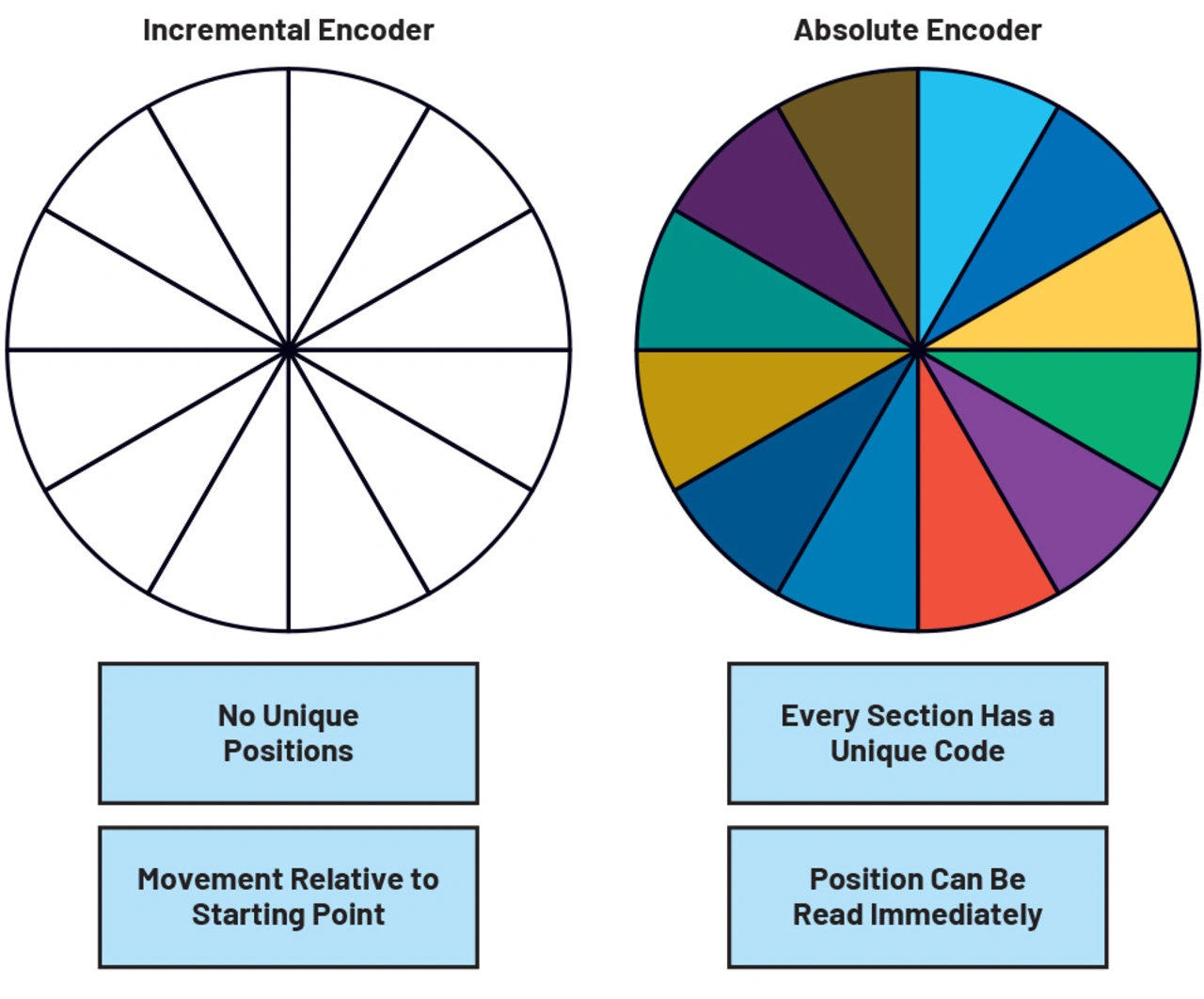 Singleturn-Absolutwert-Encoder liefern unmittelbar nach dem Einschalten eine Information über die absolute Position (innerhalb mechanischer oder elektrischer 360°). Die Position der Motorwelle lässt sich also unmittelbar auslesen. Multiturn-Absolutwert-Encoder geben die Lage der Motorwelle als Absolutwert aus und zählen überdies die Anzahl der 360°-Umdrehungen. Im Gegensatz dazu liefern Inkremental-Encoder eine Positionsinformation bezogen auf den Beginn der Rotation. Sie enthalten eine Referenzmarke zur Kennzeichnung der 0°-Position und liefern entweder Einzelimpulse zum Zählen der Umdrehungen oder Doppelimpulse, damit zusätzlich eine Information über die Drehrichtung zur Verfügung steht.