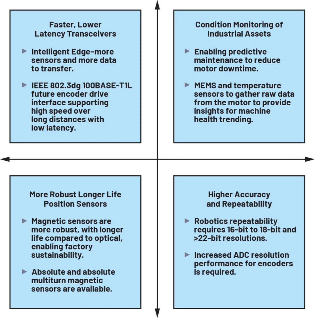 Erhebungen von Rockwell [1] für Servoantriebe, Encoder und deren Kommunikations-Ports haben ergeben, dass das jährliche Wachstum bei Transceivern, die zur Übertragung von Feedback-Signalen dienen, 20 Prozent beträgt. Single-Pair-Ethernet-Transceiver (SPE), die auf zwei Adern die Kommunikation mit 100 Mbit/s unterstützen (IEEE 802.3dg bzw. 100BASE-T1L), werden derzeit sondiert, und künftige Encoder-Schnittstellen werden von der geringen Latenz profitieren (hier zielt man auf einen Wert von ≤1,5 µs). Diese geringe Latenz wird eine schnellere Übertragung von Rückkopplungsinformationen ermöglichen und die Reaktionsgeschwindigkeit der Regelschleifen insgesamt erhöhen.