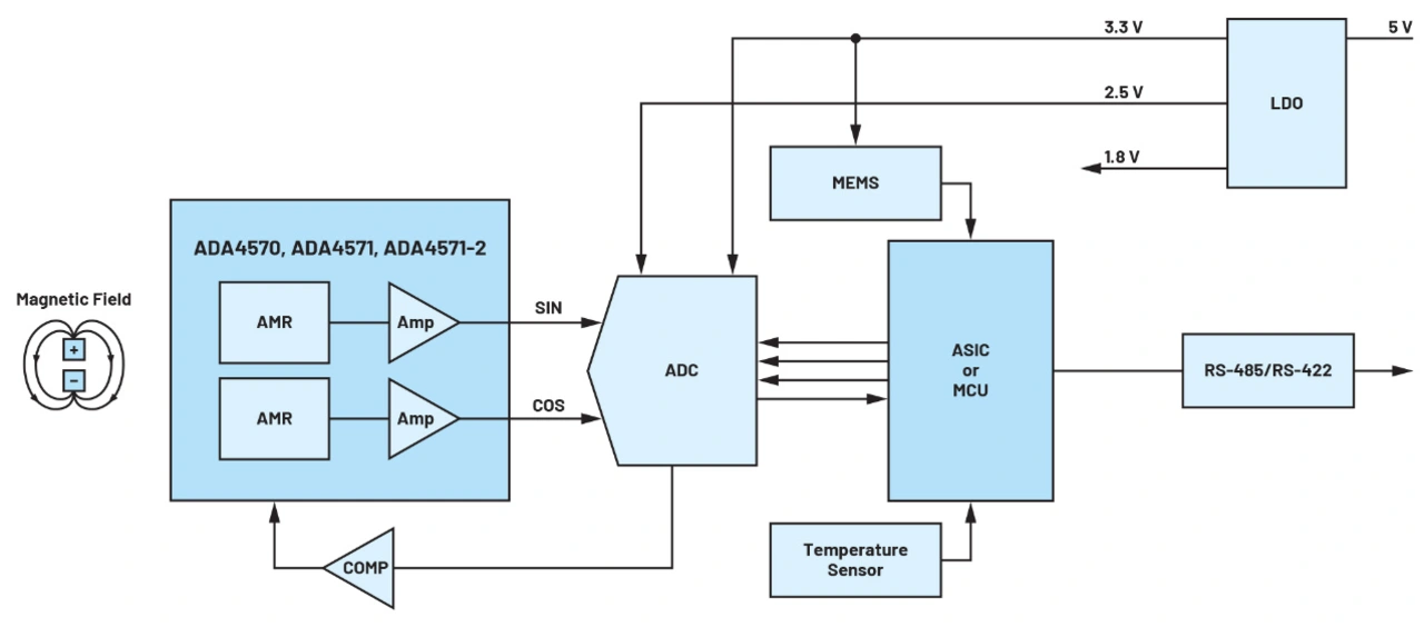 In den Bildern 6 bis 9 sind Signalketten für magnetische Encoder in AMR- (Anisotropic Magnetoresistive) und Halleffekt-Technik, für optische Encoder und für Resolver dargestellt. Die verwendeten Bauteile lassen sich in fünf Kategorien einteilen:
