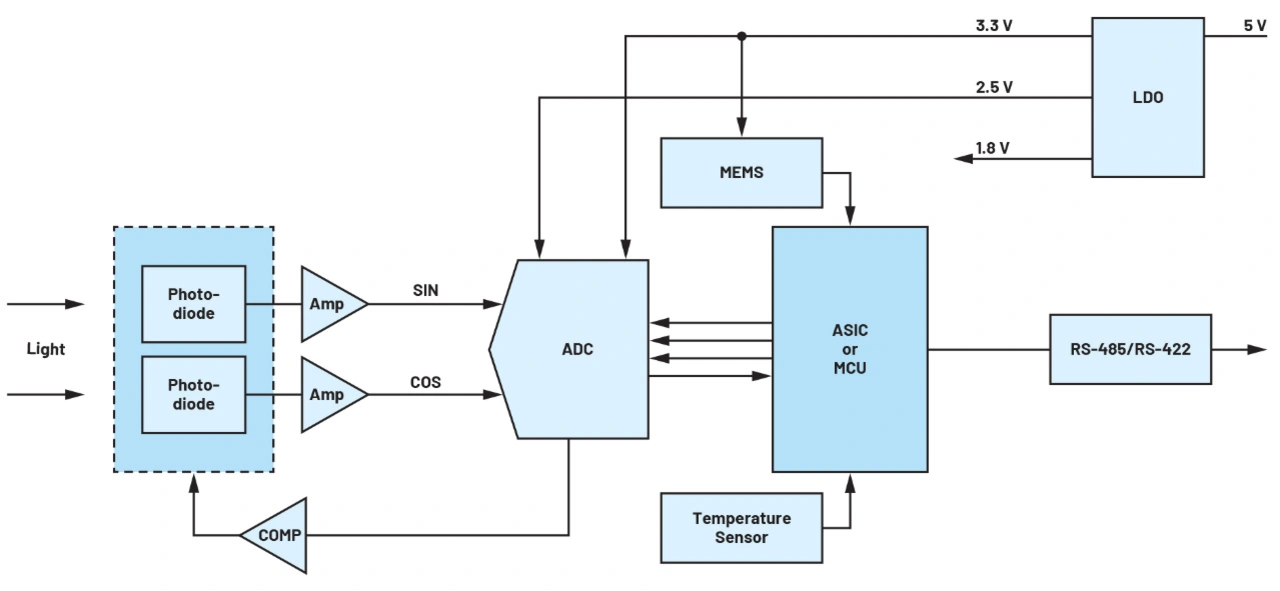 Die Signalketten-Bauelemente für optische Encoder sind fast identisch mit jenen, die im Abschnitt über AMR-basierte magnetische Encoder beschrieben wurden. Um jedoch die Voraussetzungen für höhere Encoder-Auflösungen zu schaffen, wird die Verwendung des Sigma-Delta-A/D-Wandlers (Σ-Δ) AD7760 (2,5 MSample/s, 24 bit, SNR: 100 dB) empfohlen. Dieser kombiniert eine große Eingangsbandbreite und hohe Geschwindigkeit mit den Vorteilen der Sigma-Delta-Umwandlung und kommt damit bei 2,5 MSample auf einen Signal-Rausch-Abstand von 100 dB, wodurch er sich gut für die schnelle Datenerfassung eignet.