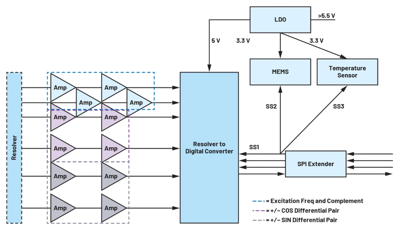 Kommt der LTC4332 zum Einsatz, wird der SPI-Ausgang des AD2S1200 in eine robuste, differenzielle Feldbus-Schnittstelle verwandelt. Weil der LTC4332 drei untergeordnete Select-Leitungen enthält, lassen sich überdies weitere Sensoren wie etwa MEMS- und Temperatursensoren an denselben Bus anschließen wie der AD2S1200.