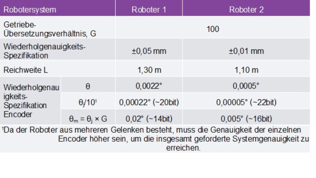 In den Robotersystemen aus Tabelle 2 sind für den Gelenk-Encoder beispielsweise Wiederholgenauigkeiten von 20 bit bis 22 bit erforderlich, während für den Motor-Encoder eine Auflösung von 14 bit bis 16 bit nötig ist.