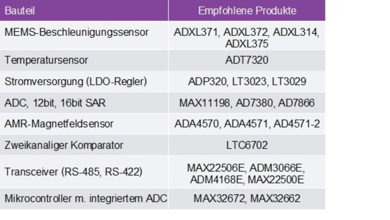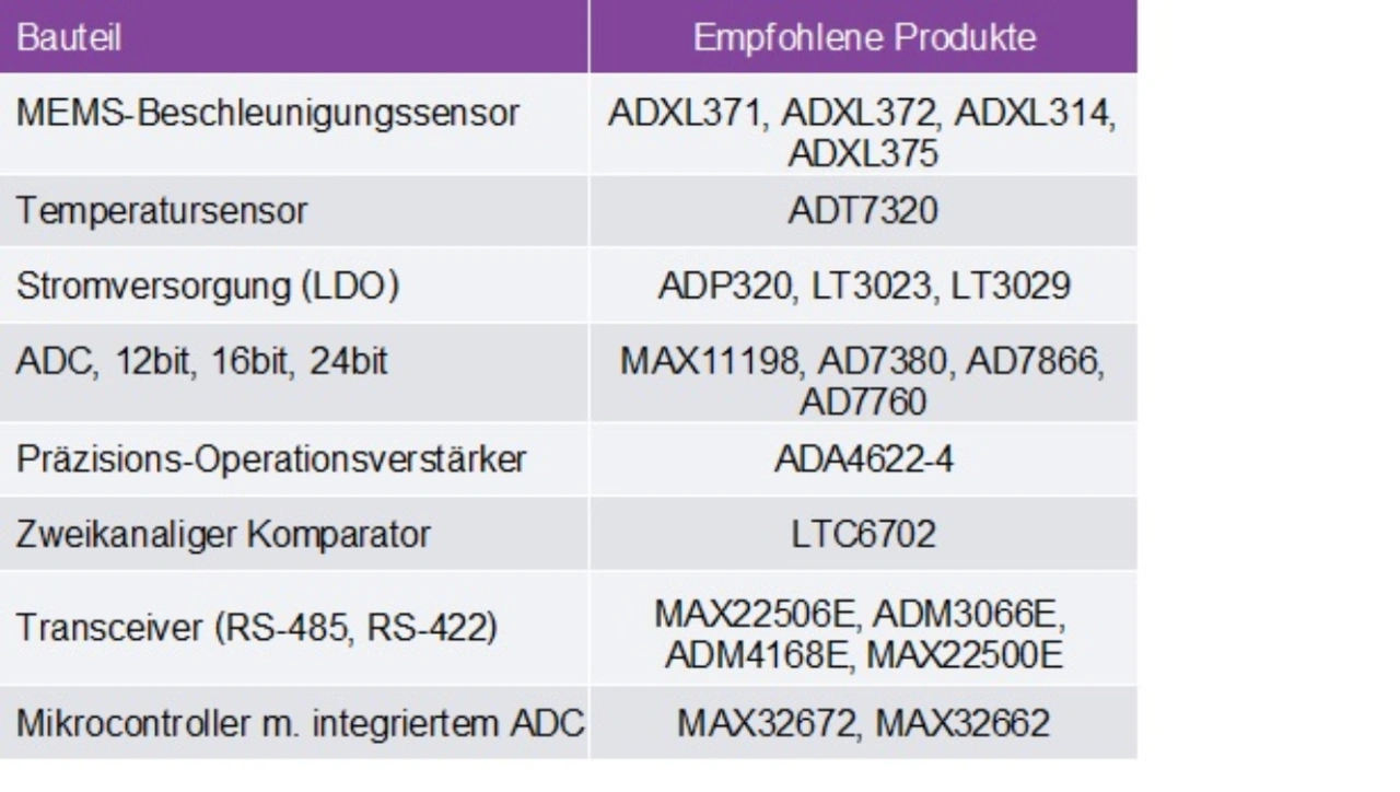 Unter der Bezeichnung ADXL371 wird ein 3-Achsen-MEMS-Beschleunigungssensor mit extrem geringem Stromverbrauch, digitalem Ausgang und einem Messbereich von ±200 g angeboten, der sich für die Maschinenüberwachung eignet. Der kosteneffektive Baustein ist in einem nur 3 x 3 mm messenden Gehäuse untergebracht und eignet sich für Betriebstemperaturen bis zu 105 °C. Im Instant-On-Modus nimmt der ADXL371 nur 1,7 µA auf, überwacht die Umgebung aber gleichwohl auf Stöße. Sobald er einen Stoß registriert, dessen Stärke den intern eingestellten Grenzwert überschreitet, wechselt der Baustein so schnell in die normale Betriebsart, dass das Ereignis noch aufgezeichnet werden kann.
