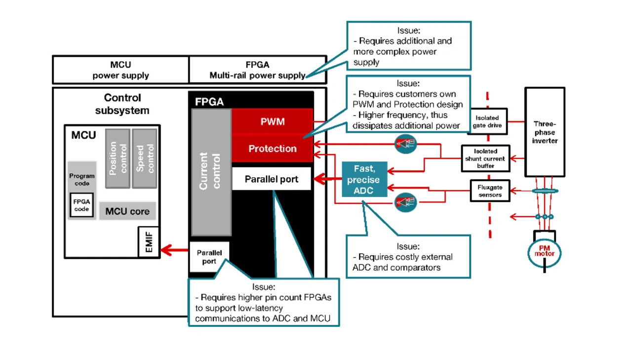 Um den gesamten Stromregelkreis abzudecken, verlangt das FPGA nach individueller Designarbeit, um die PWM-Generierung, Schutzschaltungen für den Wechselrichter und Kontrolllogik zur Abtastung des Analogsignals einzuschließen. Diese Designarbeit macht die Systementwicklung komplizierter, treibt die Gatterzahl und die Kosten des FPGA in die Höhe und bringt nicht zuletzt auch höhere Design- und Support-Risiken mit sich.