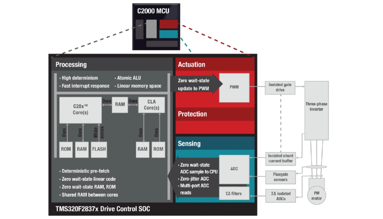 Natürlich sind beispielsweise die mit 200 MHz getakteten C28x-Verarbeitungskerne entscheidend für das Unterteilen der Arbeitsaufgaben im Interesse einer optimierten Parallelverarbeitung, jedoch gilt dies ebenfalls für die echtzeitfähige, deterministische Architektur, die diese Kerne umgibt.Da die Architektur die Verarbeitung des Systems so jitterfrei wie möglich hält, werden keine Zyklen mit Timing-Problemen oder dem Durchlaufen von Fehlerkorrektur-Routinen vergeudet.