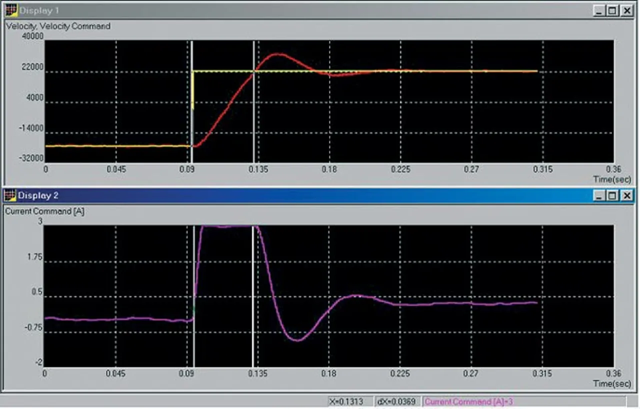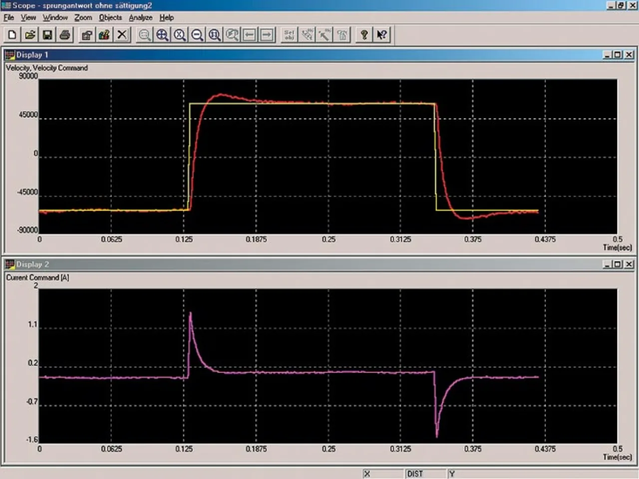 Das Verhalten des Reglers lässt sich mit der Auswahl unterschiedlicher Amplituden des rechteckförmigen Referenzsignals genauer untersuchen. Bei der Untersuchung der Eigenschaften des Reglers mit kleinen Referenzsignalen gerät der Motorstrom nicht in die Sättigung; so lässt sich eine genauere Aussage zur Bandbreite des Reglers treffen. Bild 4 zeigt als Beispiel die Diagramme für einen Test außerhalb der Sättigung, die Bandbreite ist hier umgekehrt proportional zur Anstiegszeit (0,0114 s).