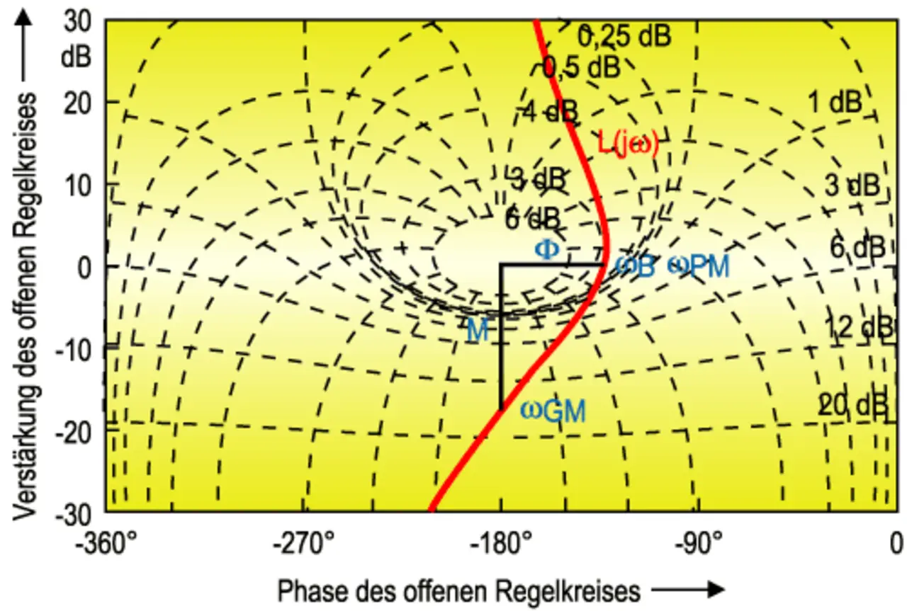 Amplituden- und Phasenrand werden am besten in einem Nichols-Diagramm für den offenen Regelkreises dargestellt. Bild 9 zeigt ein Beispiel mit einer Übertragungsfunktion des offenen Regelkreises, bestehend aus