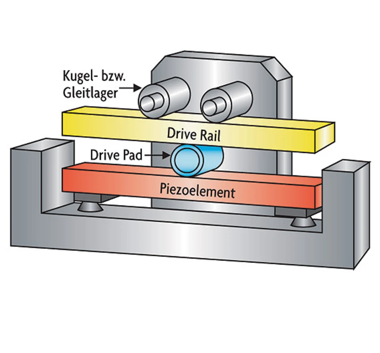 Die mechanische Ausführung des Aktors ist variabel: Die Antriebe können mit einem oder mit zwei Piezoelementen realisiert werden. Der Unterschied besteht darin, dass bei der Realisierung mit zwei Piezoelementen das Drive- Rail im Betrieb nahezu kräftefrei ist (Bild 2). Bei der Ausführung mit nur einem Piezoelement (Bild 3) ist jedoch darauf zu achten, dass das Drive-Rail mit einer rück wärtigen, reibungsarmen Lagerung durch Gleit- bzw. Kugellager zu versehen ist.