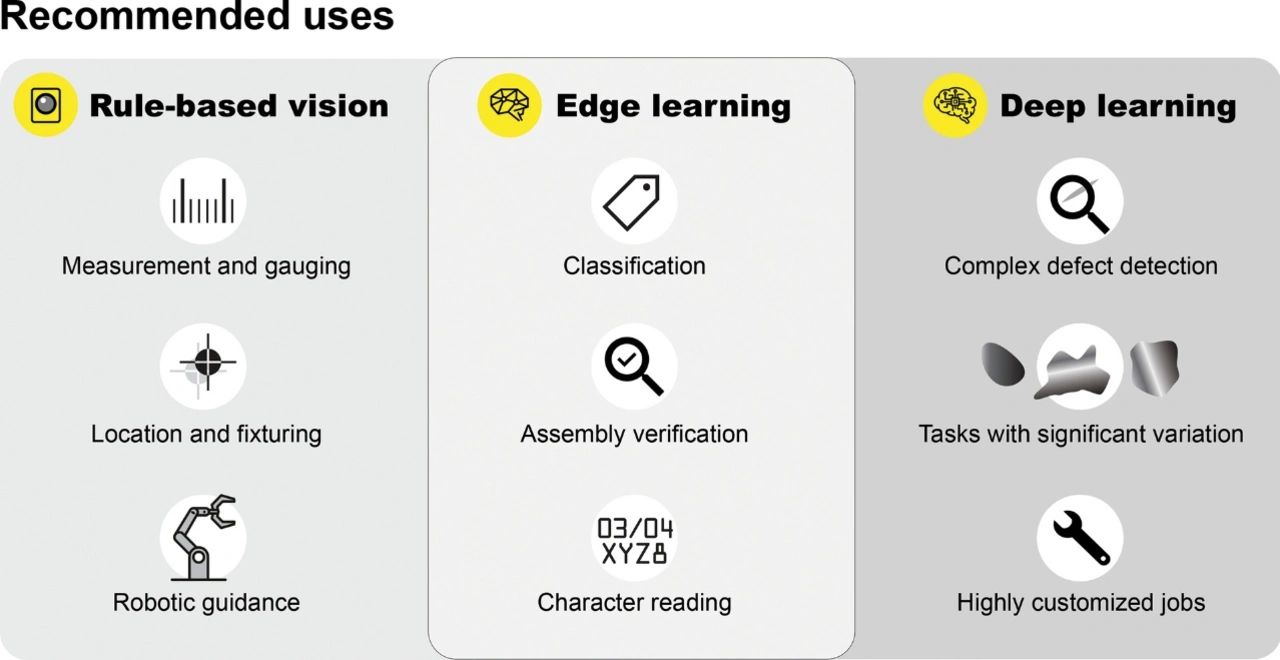 Komplexere Deep-Learning-Algorithmen auf KI-Basis sind ebenfalls in der Lage, OCR durchzuführen. Sie erreichen unter optimalen Bedingungen eine Genauigkeit von fast 100 Prozent und können jede Art von Text lesen lernen. Ihr Nachteil: Sie sind zu langsam für den unmittelbaren Einsatz an Fertigungs- oder Logistiklinien, erfordern hochentwickelte Prozessoren sowie umfangreiches Fachwissen bei der Implementierung. Für die jeweilige Anwendung vorab trainierte Edge-Learning-Tools erreichen jedoch aufgrund ihrer Spezifität die Genauigkeit generalisierter Deep-Learning-Systeme und sind dabei in der Lage, die von der Industrie geforderten Geschwindigkeiten zu erzielen.