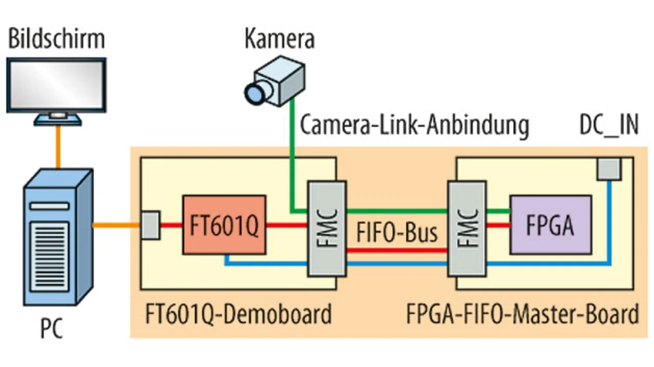 Die hochauflösende Mikroskop-Kamera wurde über den FT601, der die USB-3.0-Datenübertragungsfunktion zur Verfügung stellt, mit einem HD-Display verbunden. Das Spartan-6-FPGA von Xilinx übernimmt die Kamerasteuerung und die Datenerfassung, bevor es die Daten an den parallelen 32-bit-Datenbus des FT601Q für den Transfer an den PC bzw. letztendlich das Display übergibt. Das FPGA ist für sämtliche Timing-Funktionen verantwortlich. Dazu gehört unter anderem die Einstellung der Bildfrequenz. Der Bridge-IC enthält auch ein 32-bit-FIFO-Datenpuffer-RAM, das bei Bedarf zur Verfügung steht.