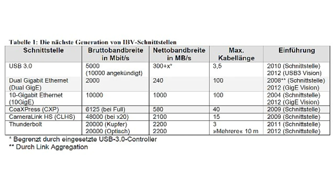 Natürlich wartet die industrielle Bildverarbeitung als innovative Branche mit entsprechenden Lösungen auf. Genauer gesagt schickt sie passende Produkte für die neuesten branchenspezifischen Schnittstellen auf Framegrabber-Basis und die jüngsten Framegrabber-losen Consumer-Standardschnittstellen ins Rennen. Tabelle 1 nennt jeweils die Schnittstelle, die Bruttobandbreite, die Kabellänge und das Jahr der marktrelevanten Einführung.