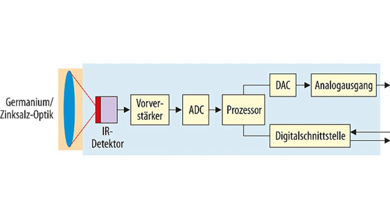 Der Preis für Infrarotkameras ist mittlerweile zwar deutlich gesunken, aber für ein hochwertiges Modell ist es auch heute noch nötig, in etwa den Gegenwert eines oberen Mittelklassewagens zu investieren. Die preisintensiven Komponenten sind der Infrarot-Detektor und die ihm vorgelagerte Optik, die entweder aus Germanium, Germaniumlegierungen oder Zinksalzen besteht. Mit günstigeren Materialien lässt sich die üblicherweise genutzte Strahlung aus dem nahen bis mittleren Infrarotspektrum (7 bis 14 μm) nicht in der nötigen Weise fokussieren. Als Detektor dient häufig eine Matrix (Focal Plane Array, FPA) mit 10.000 bis aktuell maximal 1 Mio. Pixeln, die aus Vanadiumoxid oder amorphem Silizium bestehen. Durch die Absorption von IR-Strahlung heizen sich diese Materialien sehr schnell auf und verändern dabei ihren elektrischen Widerstand. Damit ein Pixel zügig ins thermische Gleichgewicht gelangt, ist das FPA sehr dünn gefertigt (ca. 150 nm) und gegenüber den umliegenden Komponenten stark wärmeisoliert. Die Widerstandsänderung wird als Variation einer über dem Pixel abfallenden Signalspannung gemessen. Das Signal geht danach über einen Vorverstärker (Bild 1) zu einem Analog-Digital-Umsetzer. Ein Prozessor berechnet die zur Signalstärke zugehörige Objekttemperatur, die auf einem Display als Falschfarbenbild angezeigt oder zurück in ein Analogsignal umgewandelt und ausgegeben werden kann. Die Temperatur an der Oberfläche des Messobjekts ergibt sich aus dem Detektorsignal über die Gleichung