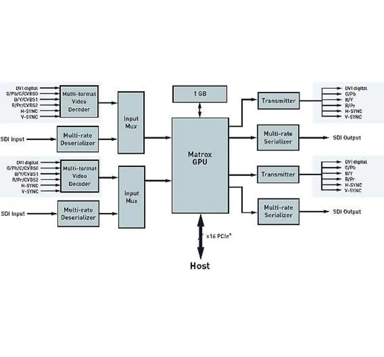 Mithilfe derartiger Multi-Board-Konfigurationen lassen sich die Video-Kreuzschienenfunktionen beliebig nach oben skalieren. Mit einer Datentransferleistung von 4 GByte/s über den PCIe-x16-Steckplatz kann die Karte zwei Full-HD-Ströme gleichzeitig in voller Geschwindigkeit erfassen. Optional lassen sich die die Videodaten im Host-PC entweder mit spezialisierter H.264-Kompressionshardware oder mit Software-Codecs komprimieren, verarbeiten, archivieren und/oder per Netzwerk zu anderen Arbeitsplätzen streamen.