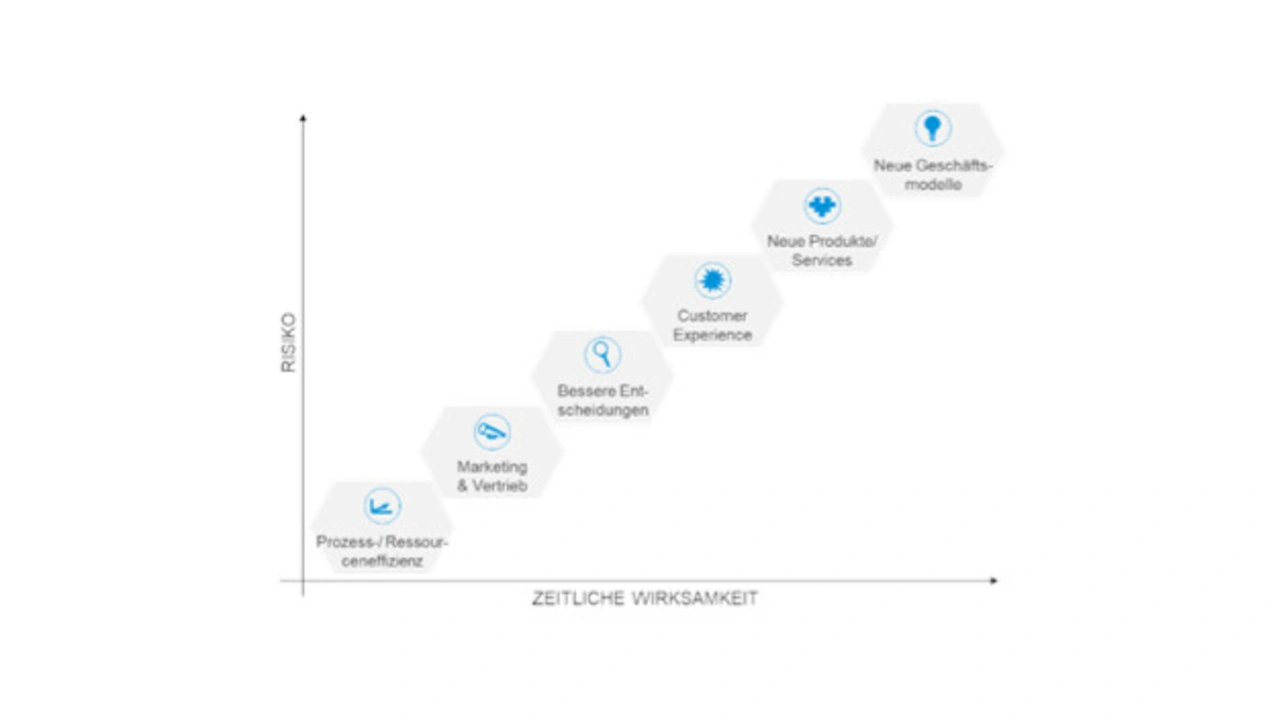 Die mit der Digitalstrategie definierte grundsätzliche Ausrichtung der Transformation wird mithilfe von sechs Werthebeln weiter konkretisiert (Bild 2). Sie lassen sich entlang der beiden Dimensionen Umsetzungsrisiken und zeitliche Wirksamkeit verorten. Die Werthebel geben an, wie Unternehmen konkret Mehrwerte mithilfe der Digitalisierung schaffen und dienen als Basis für das Entwickeln und Priorisieren konkreter Maßnahmenpakete. Sechs Werthebel lassen sich unterscheiden: