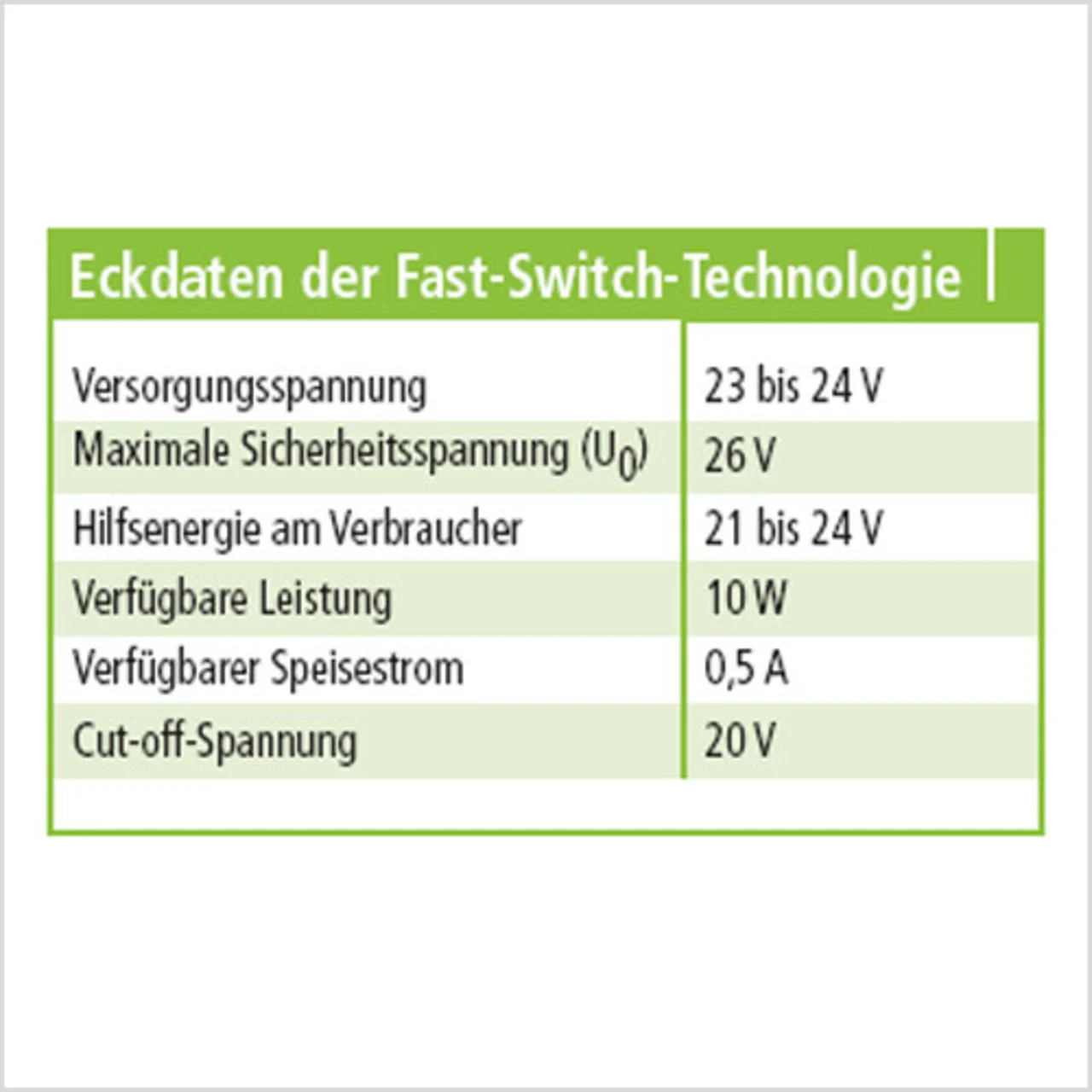Die Fast-Switch-Technologie erkennt Spannungsänderungen, die bei einem Leitungsbruch, Kurzschluss oder beim Entfernen elektrischer Verbraucher an der Trennstelle eigensicherer Stromkreise entstehen. Diese Spannungsänderungen können eine Funkenbildung an der Trennstelle (Steckkontakt oder Kabelkurzschluss) verursachen. Fast-Switch unterbricht den Stromkreis jedoch innerhalb von 10 μs und begrenzt damit die Energie an der Trennstelle auf einen sicheren Wert. Dadurch ist es physikalisch ausgeschlossen, dass ein Funke genügend Energie zur Zündung eines Gasgemisches hat.