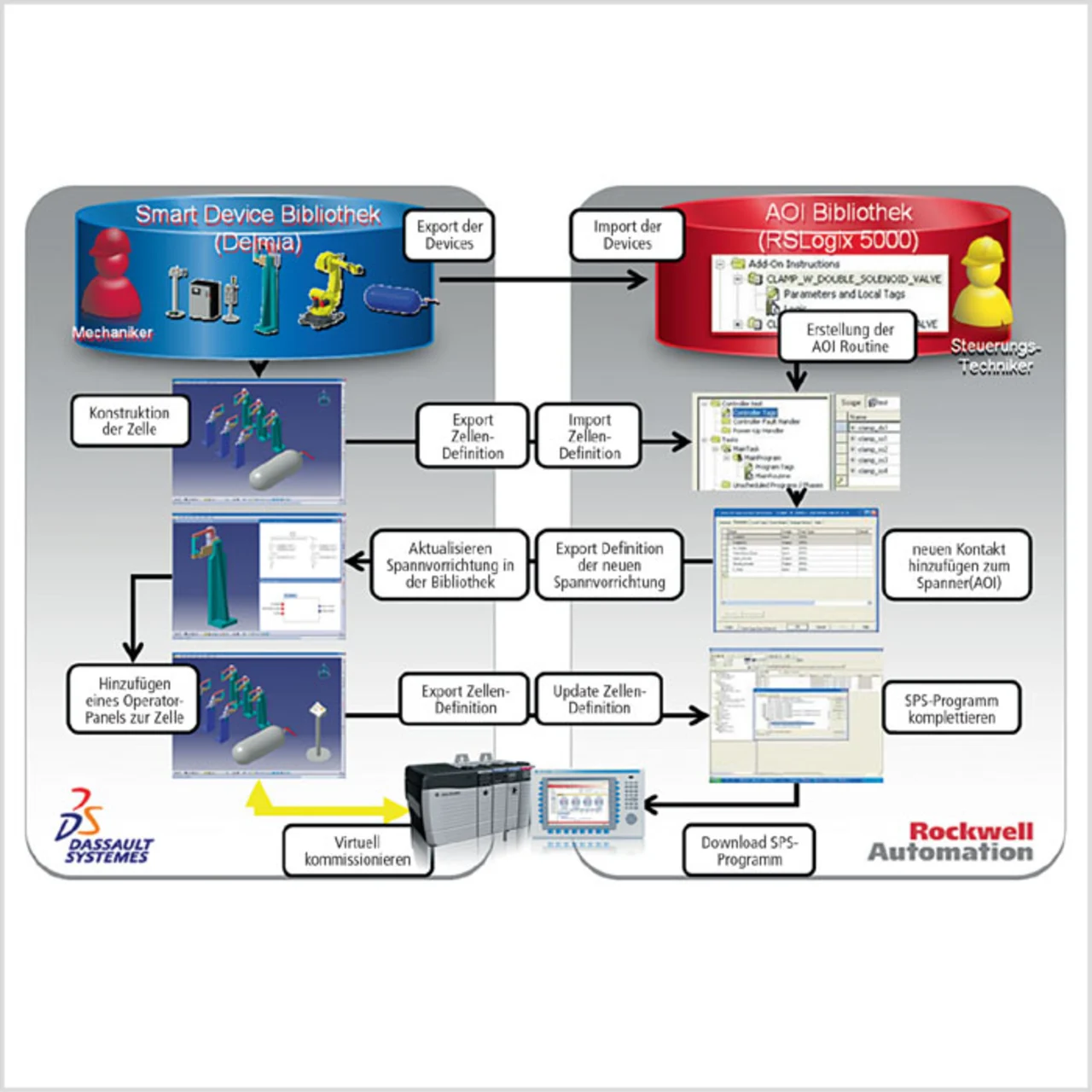 Die Datenübergabe vom Mechanik-Designtool zum Steuerungsprogrammiertool für die virtuelle Kommissionierung ist nicht neu. Entsprechende Lösungen zur Übergabe von Objekten und auch von generiertem Programmcode existieren für unterschiedliche Steuerungsfamilien. Allerdings haben diese Lösungen derzeit meist noch die Einschränkung der Unidirektionalität oder mit anderen Worten: Die Übergabe funktioniert in der Regel nur als Einbahnstraße vom Engineering-Tool hin zur Steuerung. Der Weg zurück von der Steuerung zum Engineering-Tool ist nur mit Einschränkungen, erhöhtem Aufwand und nicht ohne Datenverlust möglich, weshalb diese Übergabe in der Regel meist einmalig am Ende des Designprozesses durchgeführt wird. Neu an dem vorgestellten Ansatz mit dem Logix-System von Rockwell Automation ist die bidirektionale Austauschfähigkeit von Objekten, Bibliotheken und ganzen Projekten über eine offene Objektschnittstelle, die es Engineering-Tools ermöglicht, beliebig oft und in beiden Richtungen Objektdaten auszutauschen. Diese bidirektionale Austauschfähigkeit von Objekten per XML wird beim Virtual Commissioning mit Delmia Automation heute benutzt.