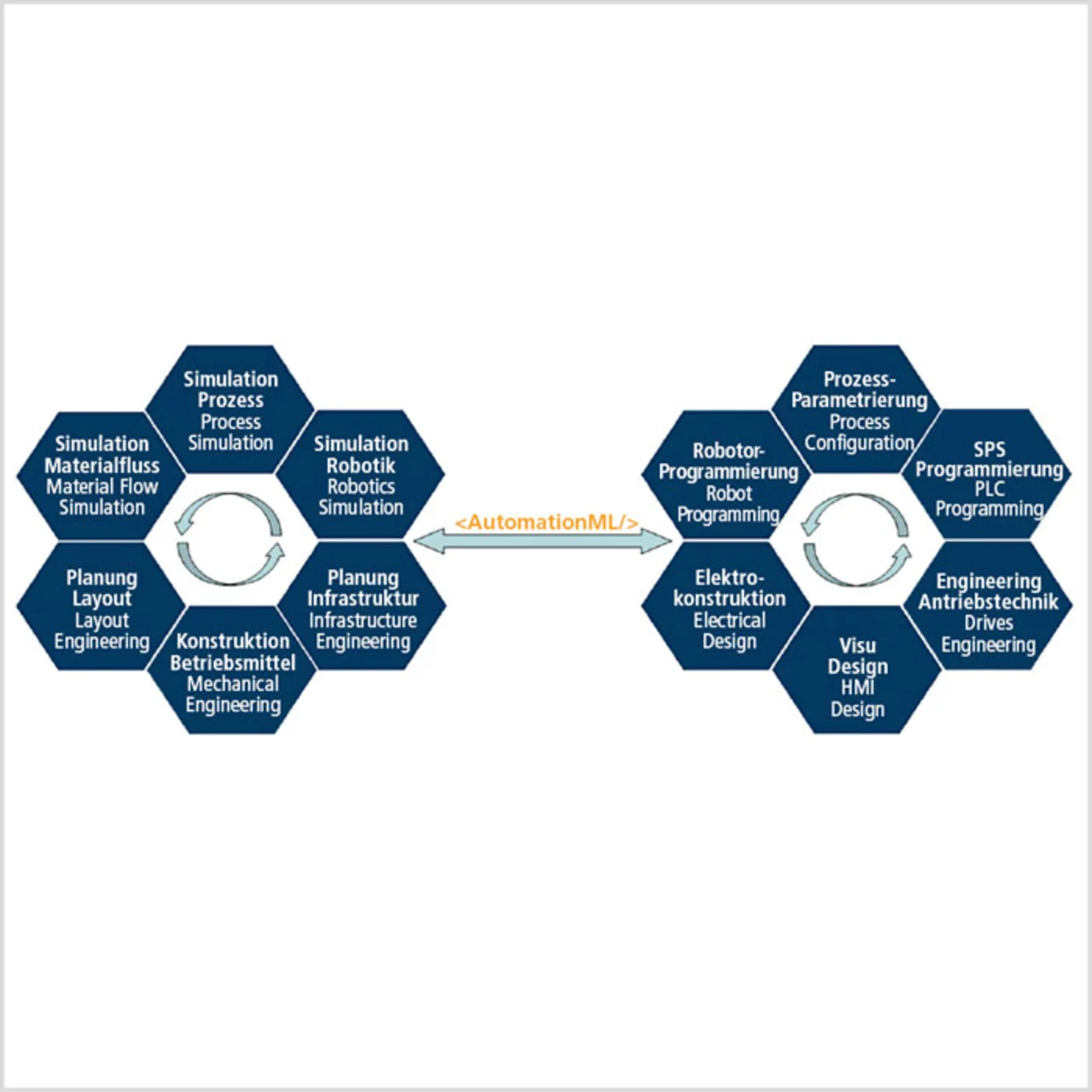 Hier setzt das Projekt „AutomationML“ an: Ein herstellerneutrales Datenformat für den durchgehenden Austausch von Engineering-Daten für alle Phasen der Fabrikplanung zu entwickeln – mit dieser Vorgabe haben vor zwei Jahren neun Unternehmen (Automobilhersteller, Steuerungshersteller, Roboterhersteller, Universitäten) ein gemeinsames Projekt gestartet. Ziel ist es, eine gemeinsame XML-basierende Datensprache für 3DGeometriebeschreibungen, Kinematik und Ablauflogik zu erschaffen. AutomationML ist inzwischen als kostenfreier, offener Standard in der Spezifikation V1.0 veröffentlicht und beschreibt einen einheitlichen, bidirektionalen Datenaustausch zwischen Engineering-Tools von der Planung bis zur Inbetriebnahme und dem fortlaufenden Betrieb fertigungstechnischer Anlagen. Die Motivation für die Umsetzung von AutomationML ist, neue Anlagenkonzepte effizienter planen zu können, ohne jedes Mal erheblichen Aufwand in die Austauschbarkeit von Daten investieren zu müssen; bei konsequenter Umsetzung soll so die Entwicklungsarbeit für alle Nutzer dauerhaft wesentlich vereinfacht werden.