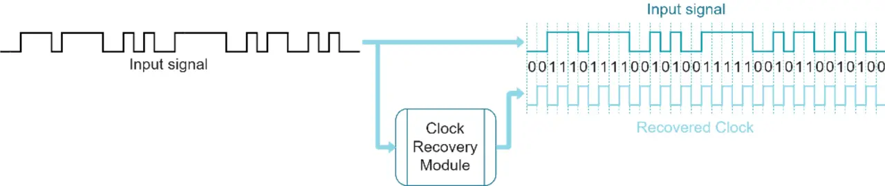 SLVS-EC (Scalable Low Voltage Signaling Embedded Clock) unterscheidet sich von den meisten der aktuellen Schnittstellen durch die Taktintegration in die Datenleitung. Der Takt kann zum Beispiel durch einen ASIC- oder FPGA-Chip der Empfänger-Hardware aus dem Signal abgeleitet werden. Daraufhin kann das Signal anhand des Takts korrekt abgetastet, also in Nullen und Einsen umgewandelt werden (Bild 1).
