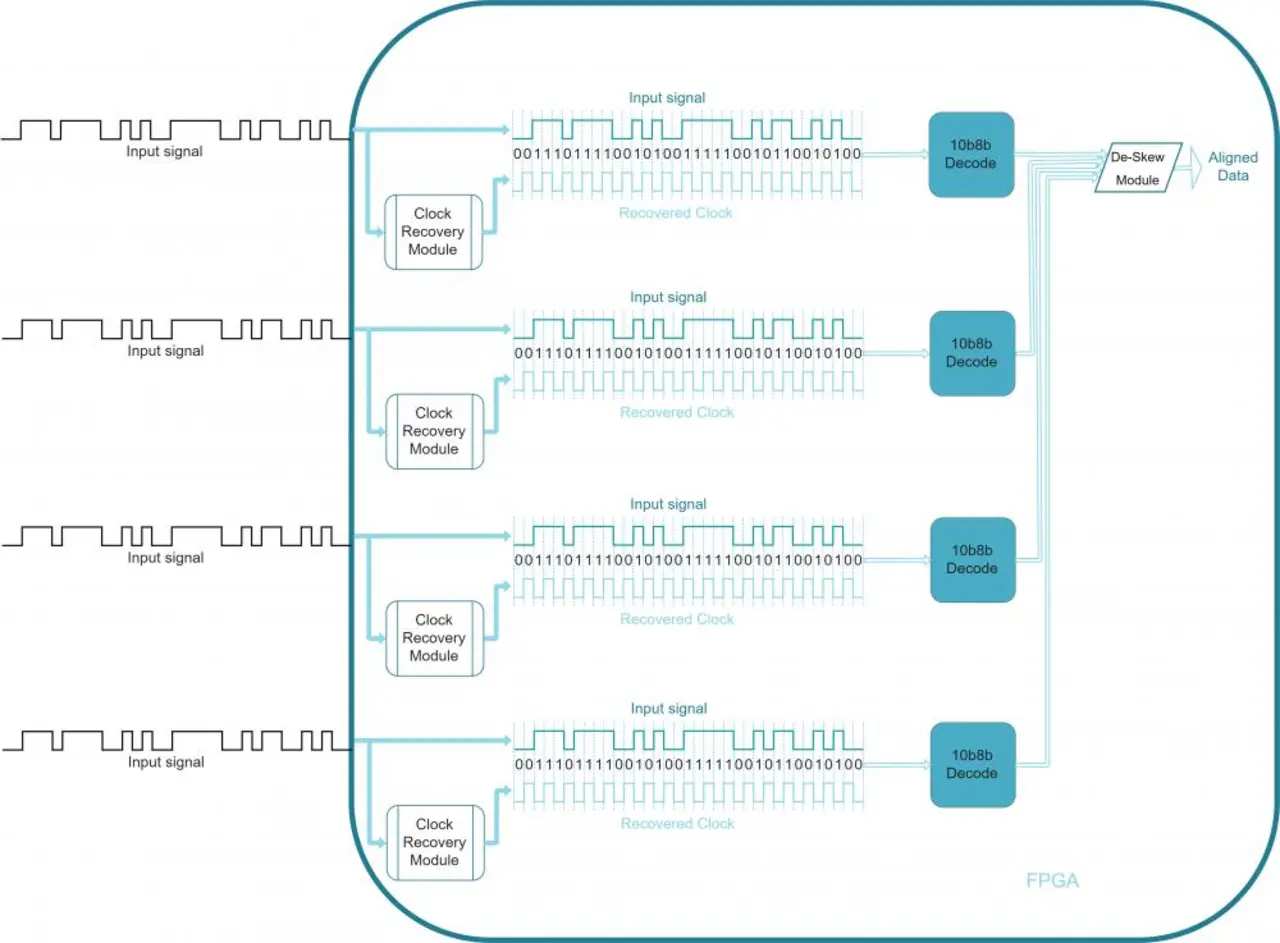 Der Prozess wird auf allen genutzten SLVS-EC-Lanes getrennt durchgeführt. Die kombinierten Daten werden basierend auf speziellen Datenpaketen, die in den Datenstrom integriert sind, aufeinander abgestimmt und zusammengeführt. (Bild 2).