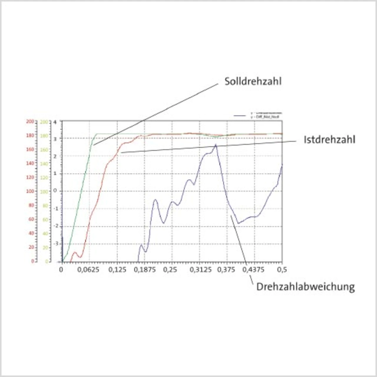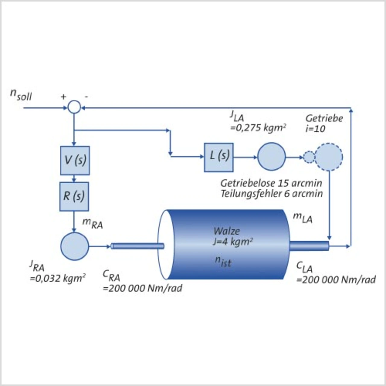 Für die Drehzahlregelung der beiden parallel arbeitenden Antriebe (Bild 3) gilt: Leistungs- und Regelantrieb sind Drehmomentsteller und erhalten einen Sollwert aus der Regelabweichung zum Drehzahlsollwert. Beide Antriebe sind jeweils drehelastisch über eine Welle mit der Last verbunden. Zur Beschreibung des Systems lassen sich fünf Gleichungen heranziehen: Zwei Gleichungen für Verstärkung und Übertragungsfunktion für Regel- und Leistungsantrieb, zwei Bewegungsgleichungen für Regel- und Leistungsantrieb sowie die Ausgangsgleichung mit der Zusammenschaltung der beiden Antriebe. Mit diesen fünf Gleichungen lässt sich die Übertragungsfunktion des Gesamtantriebs bestimmen, in der sich auch die Fehler des Leistungsantriebs finden.