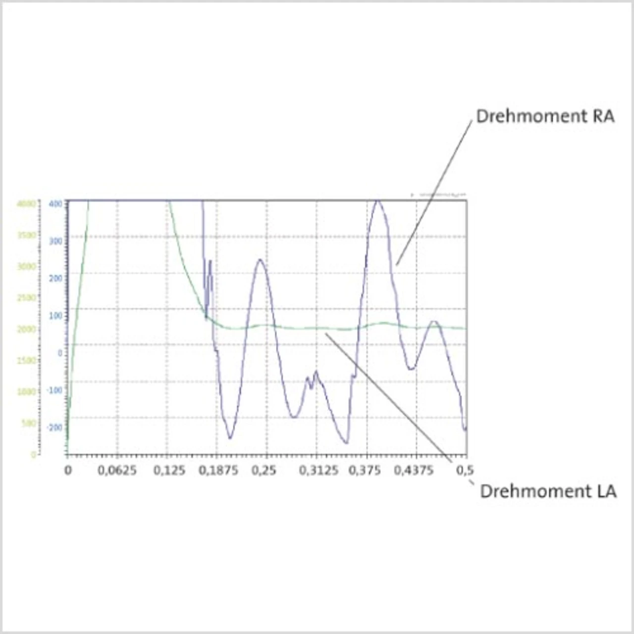 Abbildung 5 zeigt den Drehzahlverlauf mit Eingriff des Regelantriebes. Der Regelantrieb ist dabei über eine stark vereinfachte Übertragungsfunktion mit Tiefpass 2. Ordnung eingebunden. Mit dieser sehr einfachen Regelung lässt sich die Drehzahlabweichung bereits auf weniger als die Hälfte des Ursprungswertes reduzieren (2 Umdrehungen pro Minute). Das in Bild 6 aufgenommene Drehmoment des Regelantriebes beträgt maximal 400 Nm beziehungsweise effektiv weniger als 200 Nm, um die Fehler des Leistungsantriebes mit 2000 Nm zu korrigieren. Ergo muss der Regelantrieb nur für weniger als 20 Prozent des Drehmoments des Leistungsantriebes ausgelegt werden. Obschon die rechnerische Simulation das große Potenzial dieses Konzepts aufzeigt, steht die tatsächliche Erprobung noch aus.