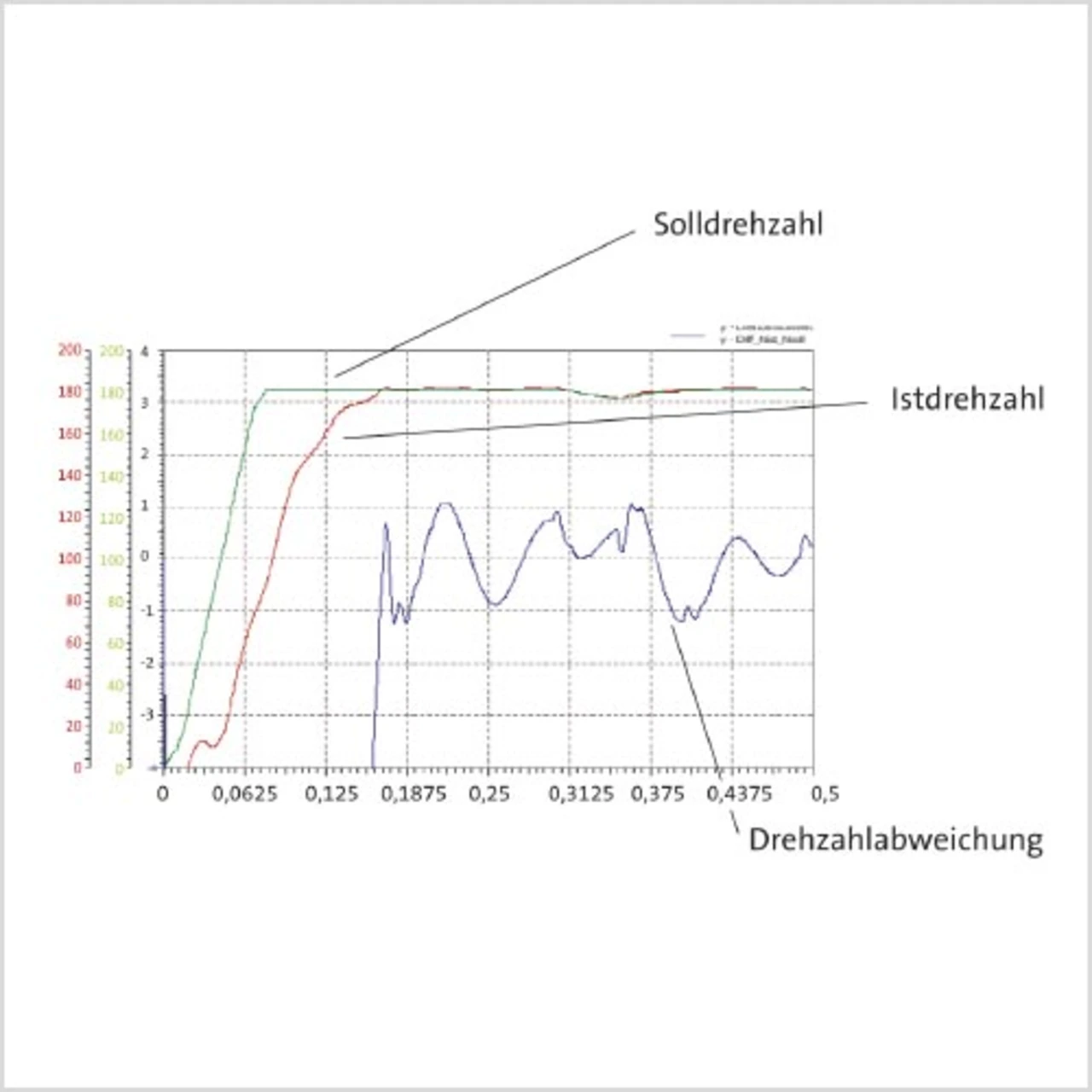 Die Bilder 4 bis 6 zeigen beispielhaft die Simulation eines Antriebes mit einer Solldrehzahl von 180 Umdrehungen pro Minute und einem Nenndrehmoment von 2000 Nm. Der Antrieb dient als Gleichlaufantrieb und muss kleinen Sollwertänderungen um eine mittlere Drehzahl herum möglichst gut folgen. In Bild 4 ist zunächst der Zeitverlauf der Drehzahl für den Leistungsantrieb ohne Regelantrieb dargestellt. Die Solldrehzahl weist nach dem Hochlauf auf 180 Umdrehungen pro Minute einen Sattel auf, der den Eingriff der überlagerten Winkelgleichlaufregelung repräsentiert. Deutlich erkennbar ist, dass der Leistungsantrieb dem Sollwert nur sehr verzögert folgt und auf die Sollwertänderungen kaum reagiert. Entsprechend zeigt die Differenz zwischen Soll- und Istdrehzahl Schwankungen von 4,5 Umdrehungen pro Minute.
