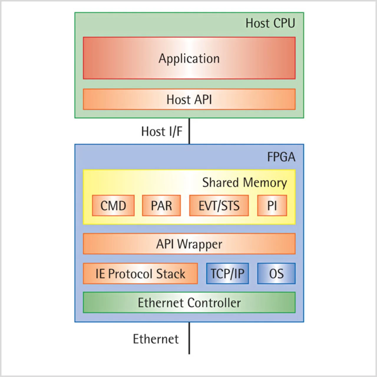 Auf Basis der FPGA-Technologe hat Ixxat ein Industrial-Ethernet-Modul entwickelt, welches standardmäßig die Protokolle Profinet-RT-IO, Ethernet/IP, Powerlink, Ethercat, Sercos III und Modus/TCP unterstützt. Für die Integration des Moduls auf der Gerätehardware ist ein Stecker vorgesehen, über den das Modul mit Spannung versorgt wird, und über den sowohl eine serielle Schnittstelle als auch eine parallele Adress-/Datenbus-Schnittstelle für die Kommunikation zwischen Geräte-CPU und Modul zur Verfügung stehen. Zur Ankopplung an die Gerätesoftware dient eine Programmierschnittstelle, welche die Funktionalität der einzelnen Protokolle weitgehend generisch der Gerätesoftware zur Verfügung stellt. Dies bedeutet, dass die Gerätesoftware unabhängig von den Industrial-Ethernet-Protokollen implementierbar ist. Ebenso ist eine zukünftige Erweiterung um zusätzliche Protokolle ohne große Änderungen an der Gerätesoftware jederzeit möglich. Die Programmierschnittstelle ist als C-Code verfügbar und damit leicht auf die verwendete Geräte-CPU anpassbar. Aufgeteilt ist die Programmierschnittstelle in vier Bereiche: Kommandoschnittstelle, Ereignis- und Statusschnittstelle, Parameterschnittstelle und Prozessdatenschnittstelle. Über die Kommandoschnittstelle steuert die Gerätesoftware das Schnittstellenmodul. Hier stehen Kommandos wie Init, Reset oder Connect zur Verfügung. Über die Ereignis- und Statusschnittstelle erhält die Gerätesoftware Informationen zum Netzwerk- und Modulstatus sowie zu aufgetretenen Fehlern. Die Parameterschnittstelle dient zur Übergabe von Lese- und Schreibzugriffen auf Geräteparameter. Da Geräte wie zum Beispiel Antriebe 1000 und mehr Parameter haben können, werden diese Daten nicht auf dem Schnittstellenmodul gehalten, sondern Zugriffe darauf direkt an die Gerätesoftware zur Ausführung weitergeleitet.