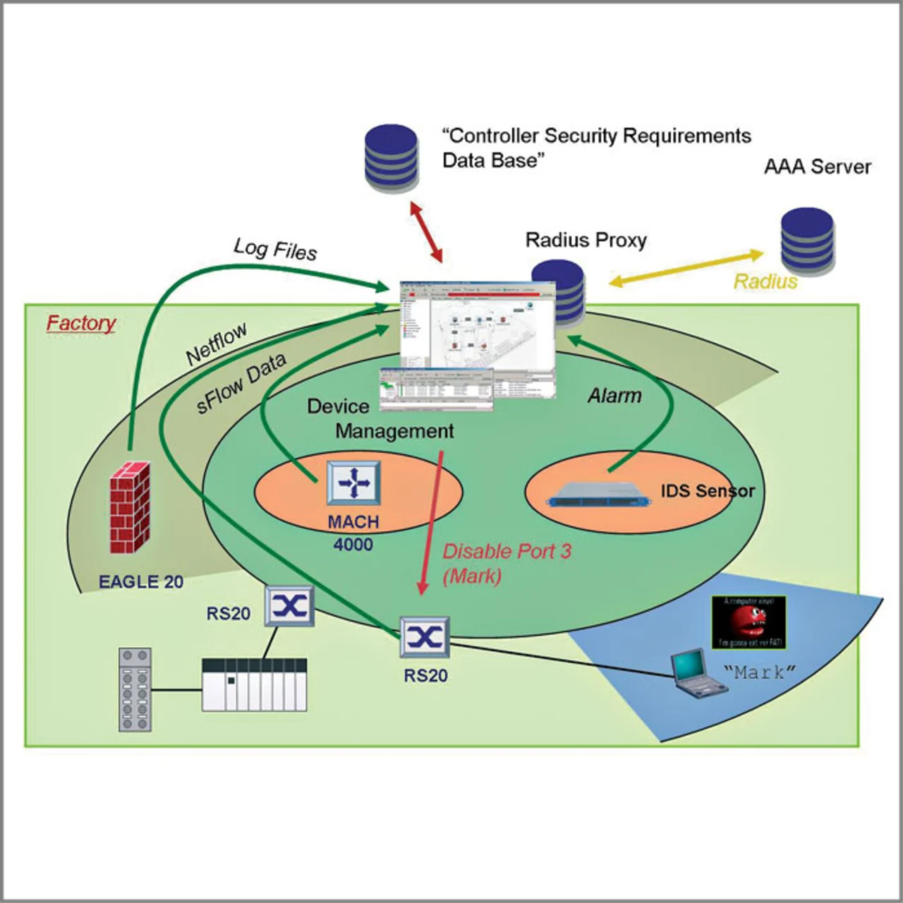 Darüber hinaus ist es für ein effektives Security-Management wichtig, einen Rückkopplungspfad zu implementieren, über den das System auch Informationen über die Wirksamkeit der implementierten Security-Funktionen bereitstellt (Monitoring & Logging). Im Rahmen der integrierten Security-Lösung stehen zu diesem Zweck verschiedenste Informationen (zum Beispiel Statusmeldungen und Logfiles) aus den einzelnen Infrastrukturgeräten wie Switches und Router sowie den IDS-Agenten zur Verfügung. Um diese Einzel-Information zu korrelieren und entsprechend zu konsolidieren, wird wiederum die Unterstützung der zentralen Management-Software benötigt.