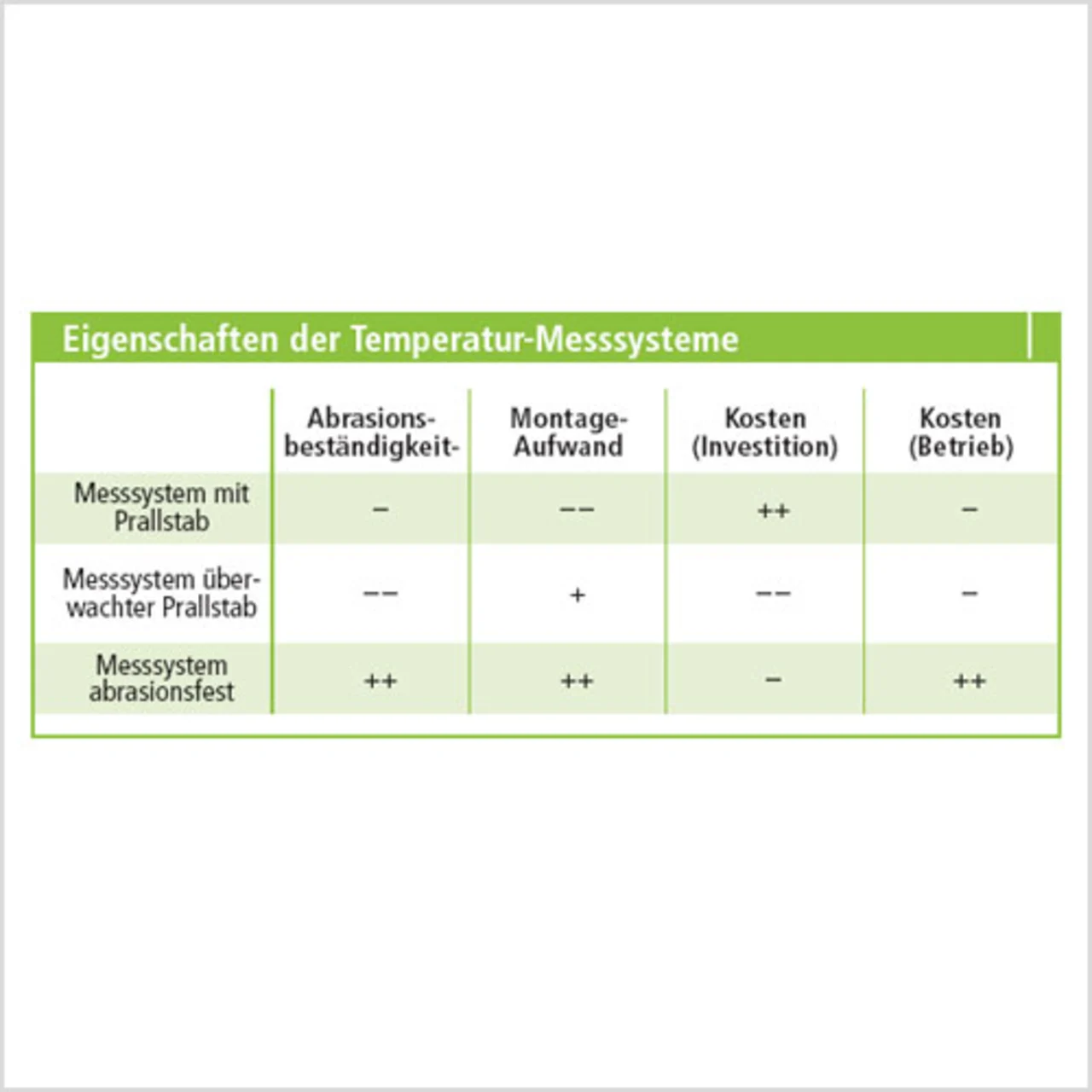 Denn sobald der Prallstab abgenutzt ist, wird der Sensor den vorbeiströmenden Staubpartikeln ausgesetzt und in kurzer Zeit ebenfalls zerstört. Selbst bei einem intakten Prallstab halten die Temperaturfühler höchstens zwölf Monate, da sie auch im „Windschatten“ des Prallstabes einem Verschleiß unterliegen. Somit muss diese Messstelle regelmäßig auf Basis von Erfahrungswerten des Betriebs gewartet werden.