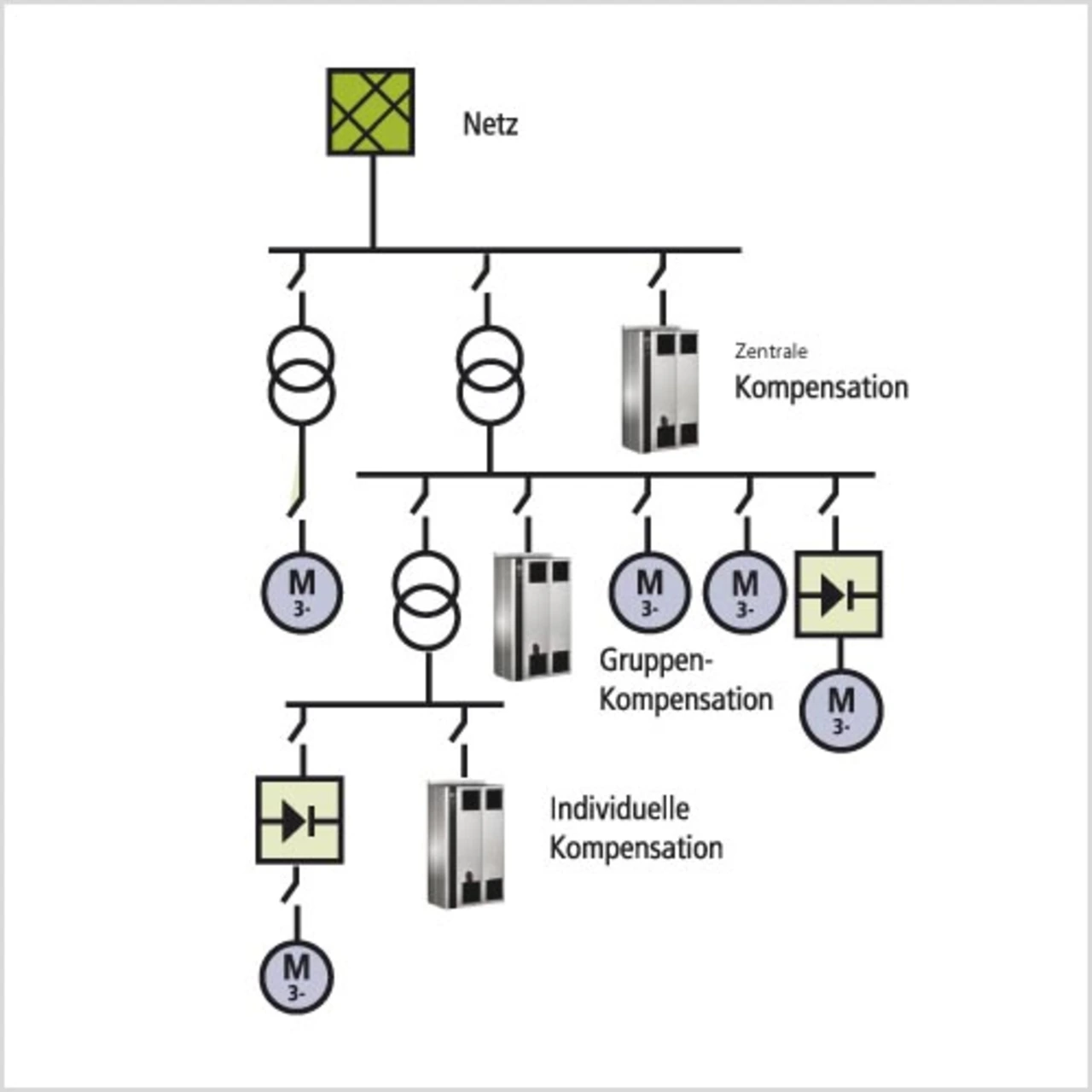 Da die Summe aller nichtlinearen Verbraucher stetig steigt, reichen geräte-interne Filtermaßnahmen oft nicht aus. Zur weiteren Reduzierung des negativen Einflusses auf die Netzqualität stehen dem Anwender verschiedene Möglichkeiten zur Verfügung: Eine davon ist, passive Filter vor die Frequenzumrichter zu schalten. Alternativ kann ein geschicktes Zusammenfassen von Antrieben zu einer „Quasi-12-Puls“-Lösung helfen, das speisende Mittelspannungsnetz zu entlasten. „Quasi-12-Puls“ bezeichnet eine Verschaltung verschiedener Geräte, die normalerweise eine so genannte 6-Puls-Gleichrichterbrücke verwenden, in der Art, dass das Ergebnis einer 12-Puls-Gleichrichtung entspricht. Die derzeit effektivste und flexibelste Lösung stellen so genannte aktive Filter dar. Sie messen die Oberschwingungsbelastung permanent, berechnen einen Komplementärstrom und speisen diesen zum Eliminieren der Oberschwingungen in das Netz ein. Eine weitere Möglichkeit besteht im Aufstellen eines neuen, größeren Transformators, der ausschließlich zur Speisung der zusätzlichen Umrichterlast dient. Die jeweils optimale Lösung kann auch eine Kombination der beschriebenen Maßnahmen sein.