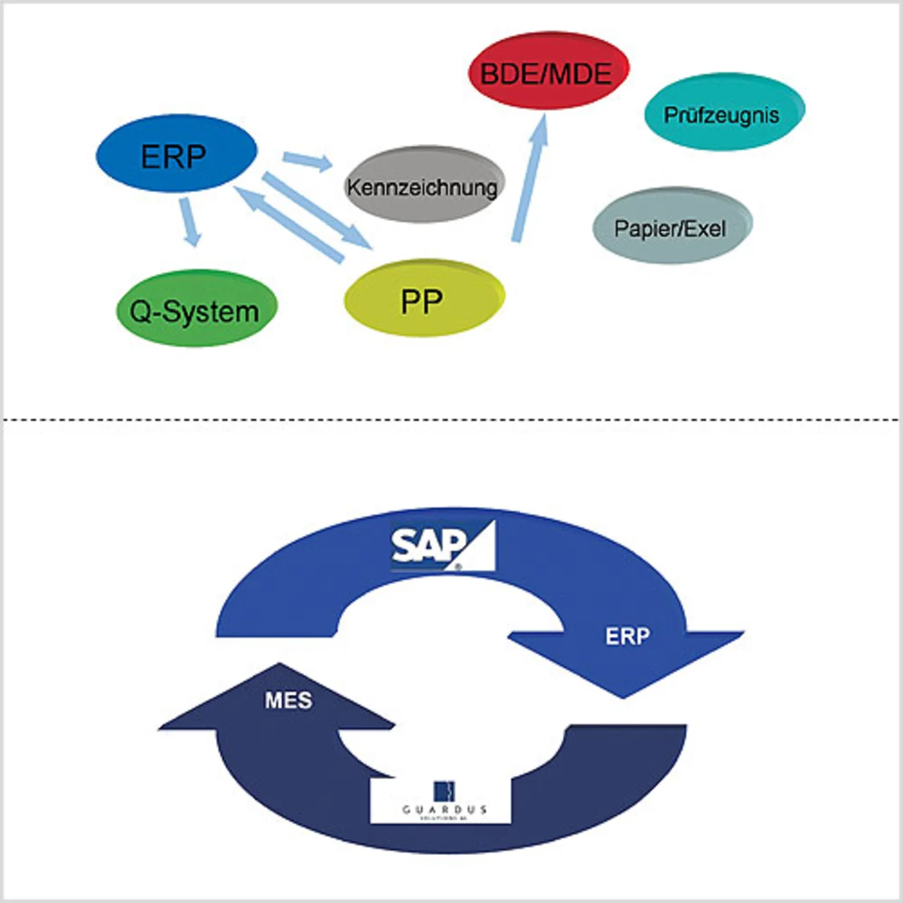 Im Pharma-Umfeld ist eine lückenlose Rückverfolgbarkeit von den verwendeten Rohstoffen bis hin zum Kunden Pflicht. Um dies über alle eingesetzten Materialien und Produkte gewährleisten zu können, übergibt SAP bereits bei der Rohstoff-Bestellung (zum Beispiel Kunststoffgranulate, Trockenmittel, Farben) sämtliche Teilenummern und Lieferanten-Daten an das MES. Trifft die Bestellung im Wareneingang ein, wird das Material in SAP verbucht, eine Chargennummer vergeben und das MES-System erhält die Information, ob eine Prüfpflicht besteht. Ist dies der Fall, generiert das MES automatisch den notwendigen Prüfauftrag, den der Qualitätsmitarbeiter abarbeitet. Eventuelle Mängel erfasst der Anwender im zentralen Maßnahmenmanagement.